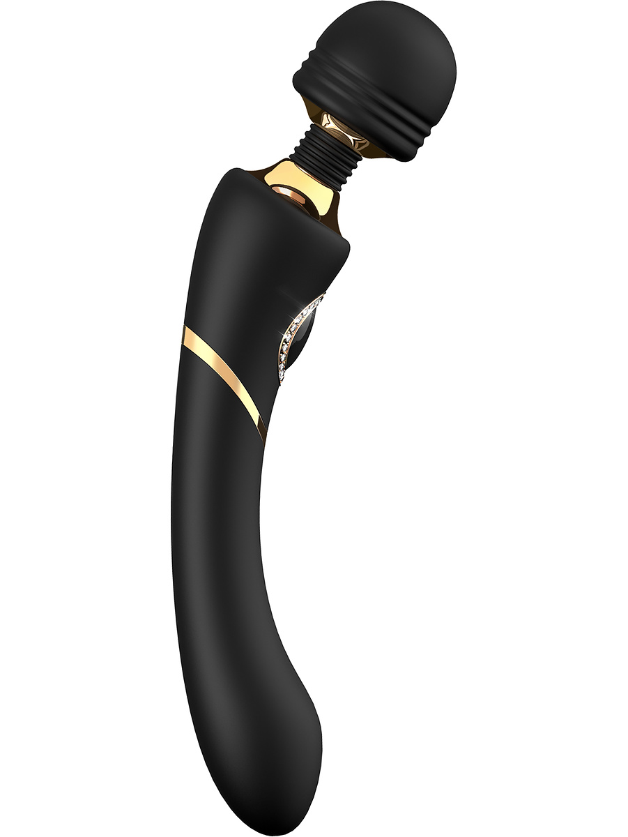Monica is a black Magic Wand in silky silicone and with delicious gold-colored details and a button with beautiful stones all around. It has an easy-to-grip handle, a flexible neck and a round head that provides a nice stimulation to the clitoris, labia or other sensitive points. It can also be used as a nice massage all over the body.