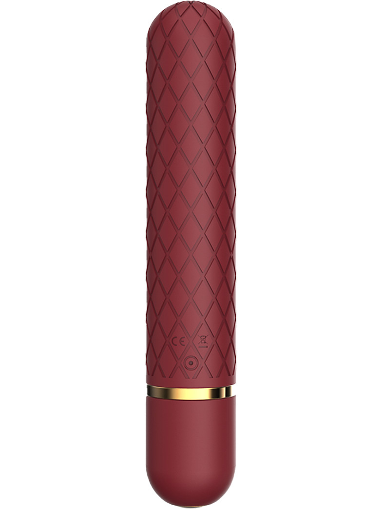 Lizzy is a ruby red and elegant bullet-vibrator in silky silicone and with stylish, gold-colored details that match perfectly. It has a minimal size and a diamond-shaped pattern that provides great stimulation to the clitoris and other sensitive points.