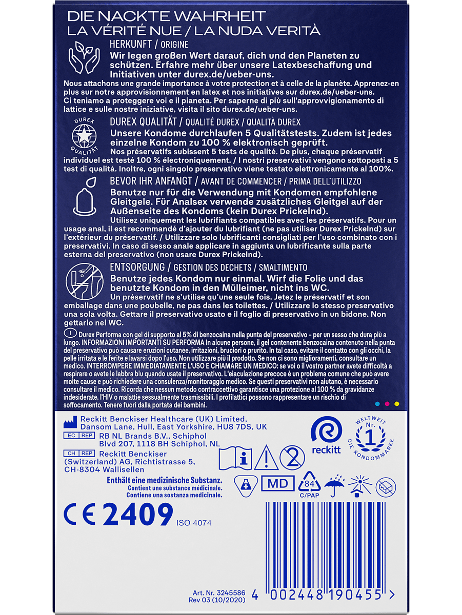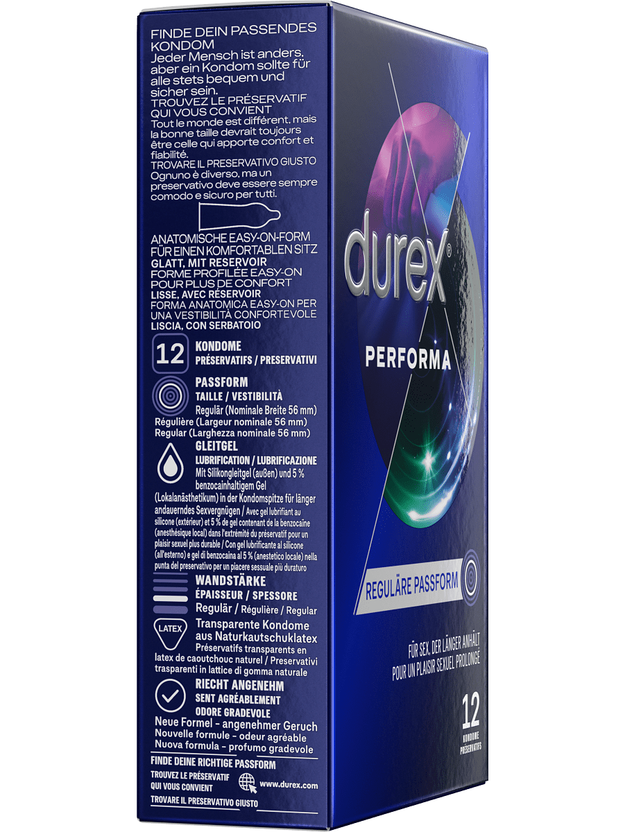 Performa from Durex contains transparent latex-condoms that are coated with a silicone-based lubricant. On the inside of the top there is also a gel with 5% benzocaine that numbs easily and helps to delay his ejaculation - perfect for those of you who want to enjoy longer sex.