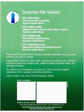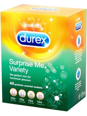 An exciting package with 40 condoms from Durex. Experiment and find your and your partner's favorite among the 4 different varieties. Everyone has different characteristics, which means that some types of condom are better suited for specific occasions.