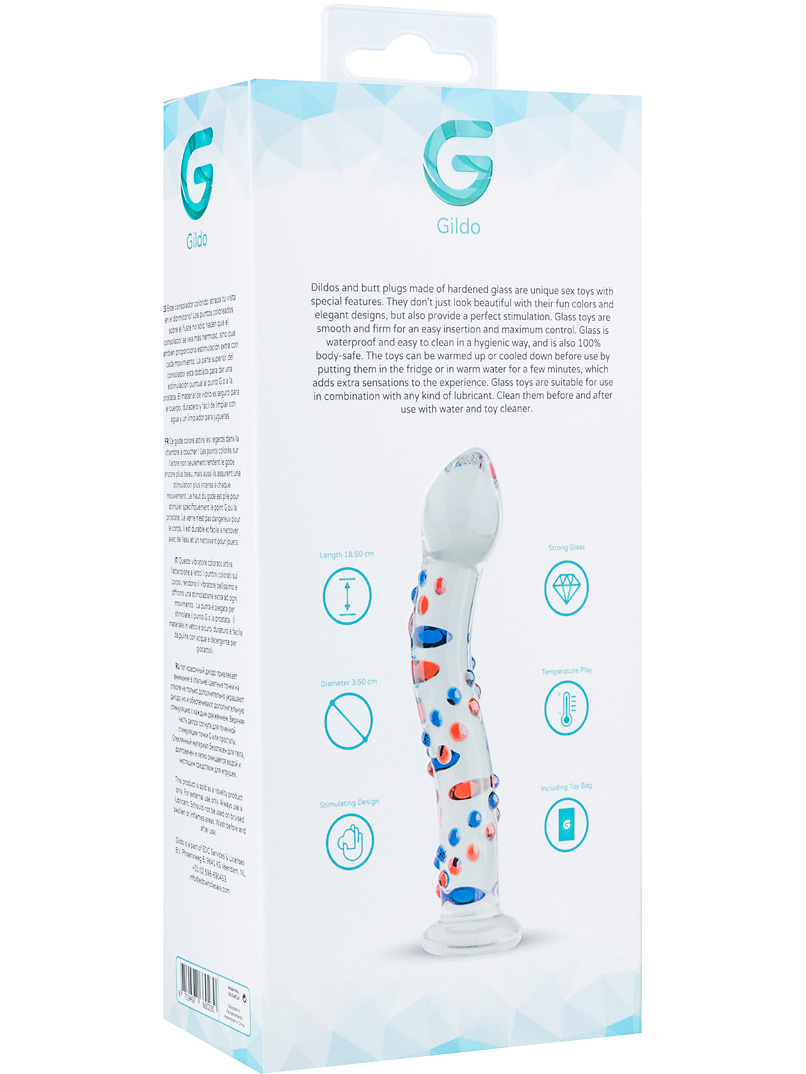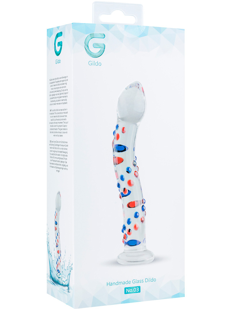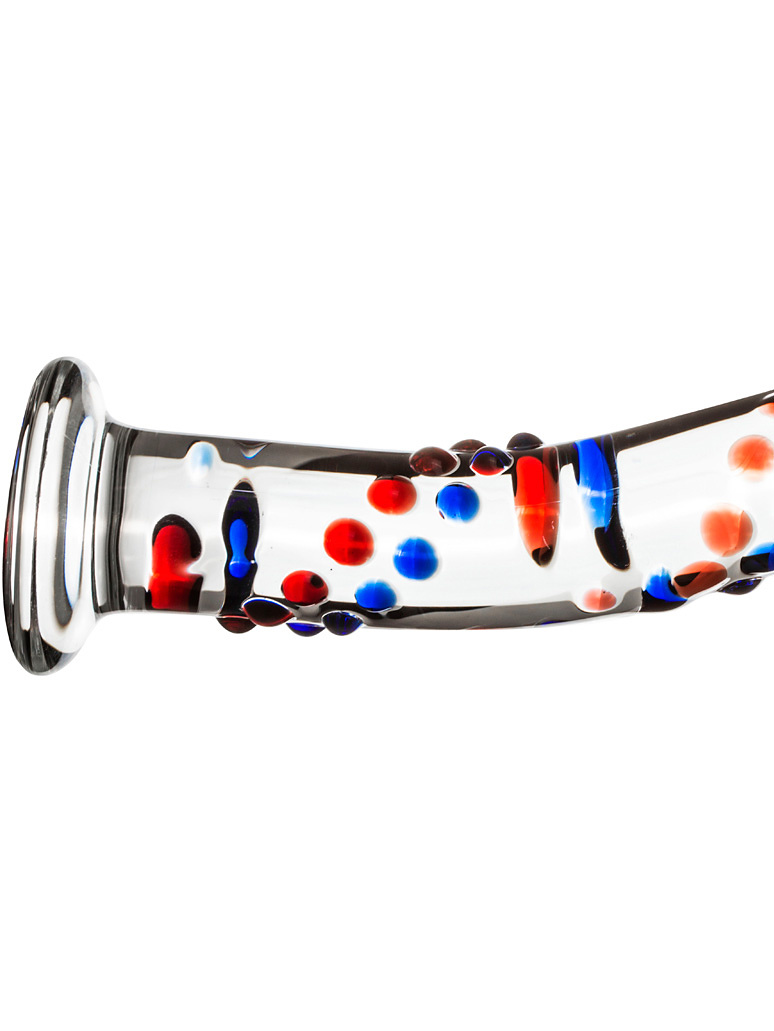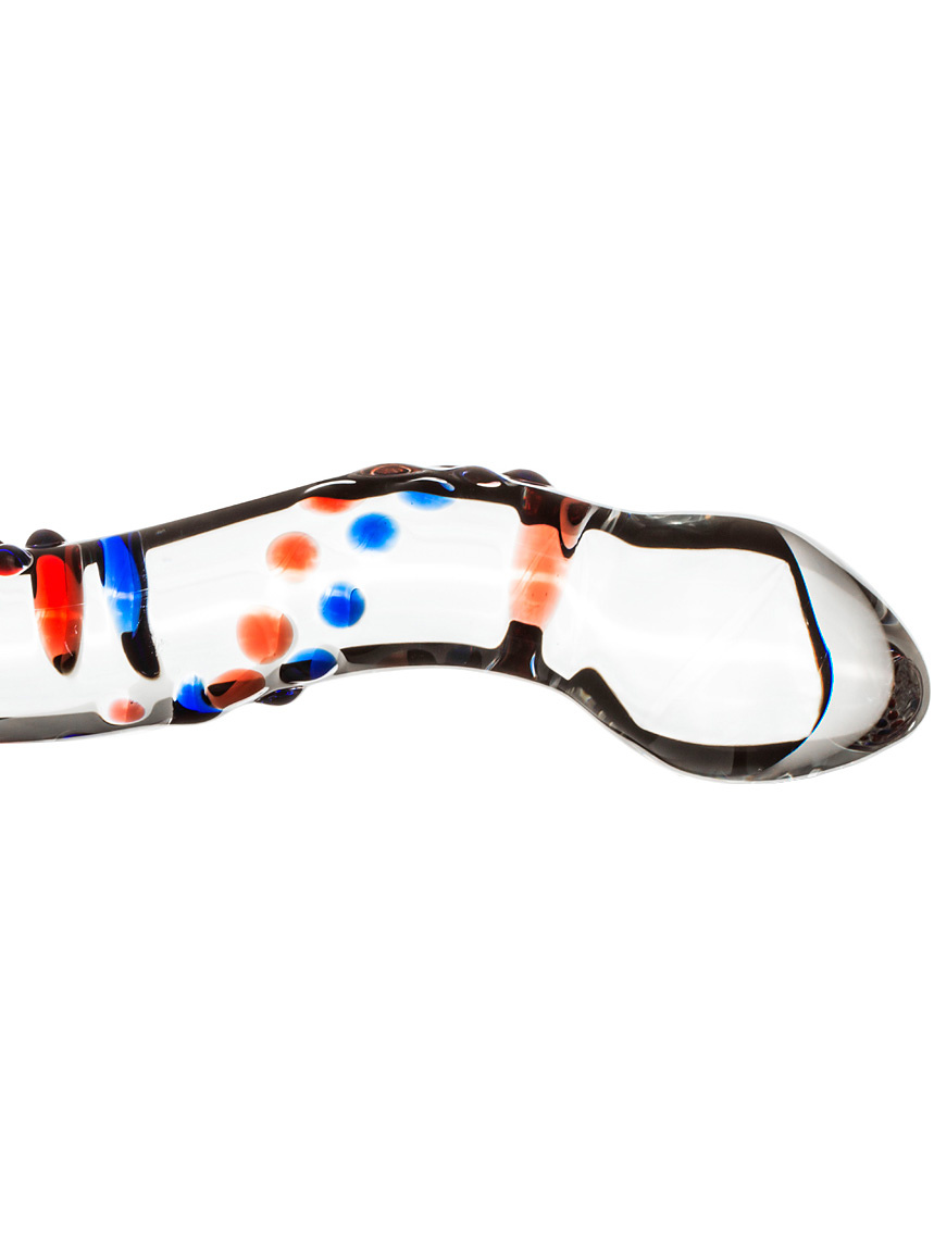 This is a completely unique dildo that really attracts all the attention in bed. The dildo is made of transparent glass with blue and red dots for a completely unique look.