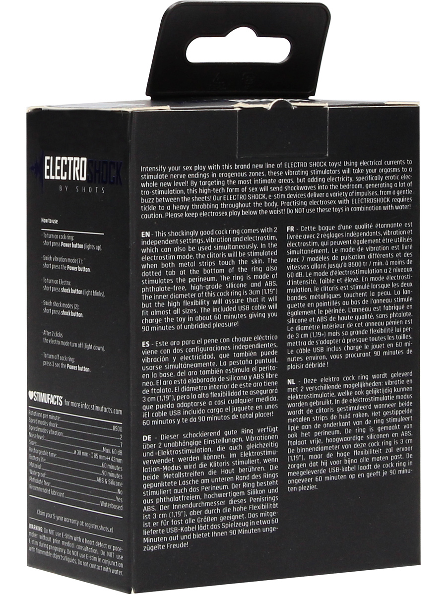 ElectroShock Cock Ring is made of high-quality, phthalate-free silicone and ABS. The inner diameter is about 3 cm but has a very flexible design that makes it fit most sizes.