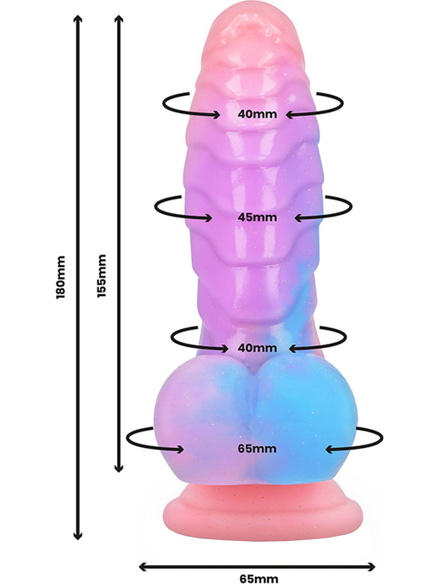Empusa is a powerful fantasy dildo that lets you explore new dimensions of pleasure. The dildo has a curved shape and stimulating textures that massage you vaginally or anally. With delicious colors, glitter and a unique design, it takes you on a journey of pleasure where you meet the mythological creature Empusa from ancient Greece.
