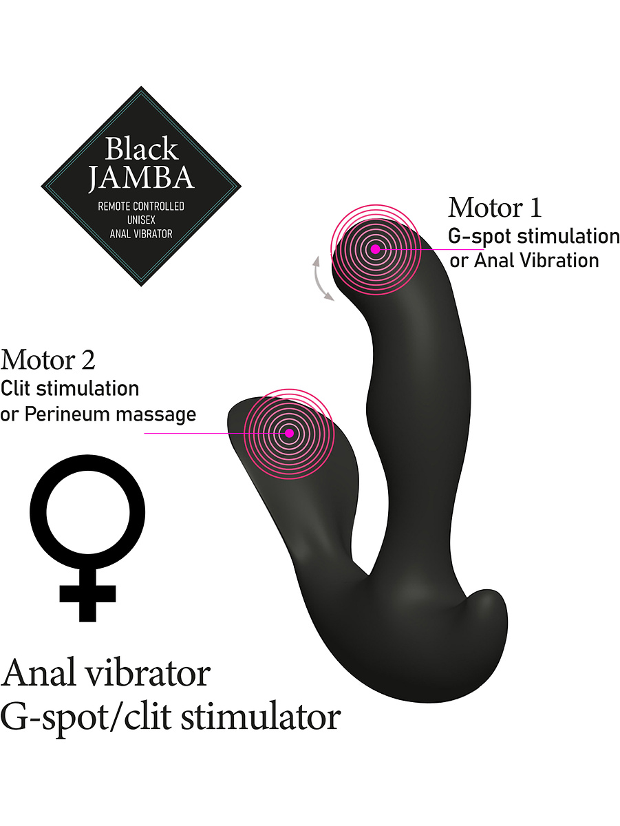 Black Jamba is a remote-controlled vibrator that can be used by both men and women. The man can use it anally to stimulate the prostate and pelvic floor. The woman can use it in two different ways: either vaginally to stimulate the g-spot and clitoris or anally to stimulate the anus and pelvic floor.
