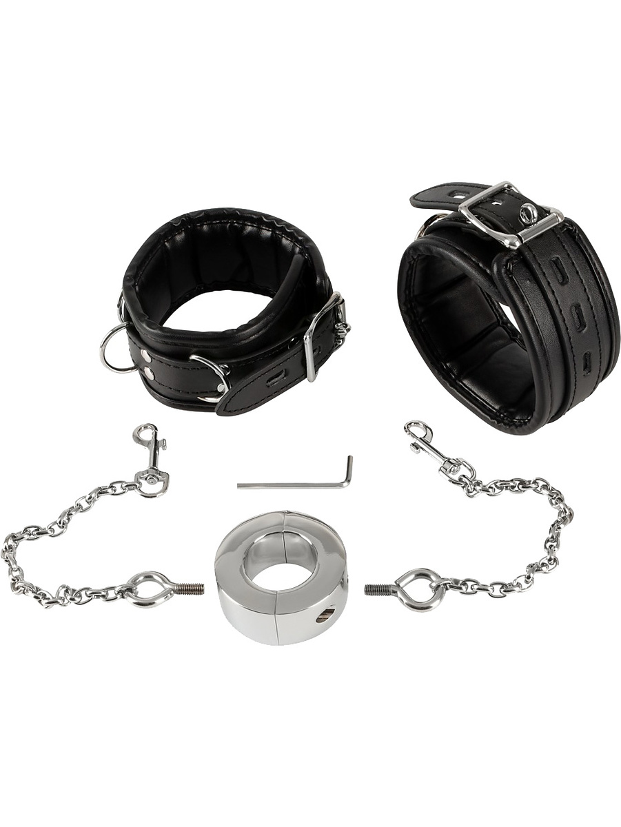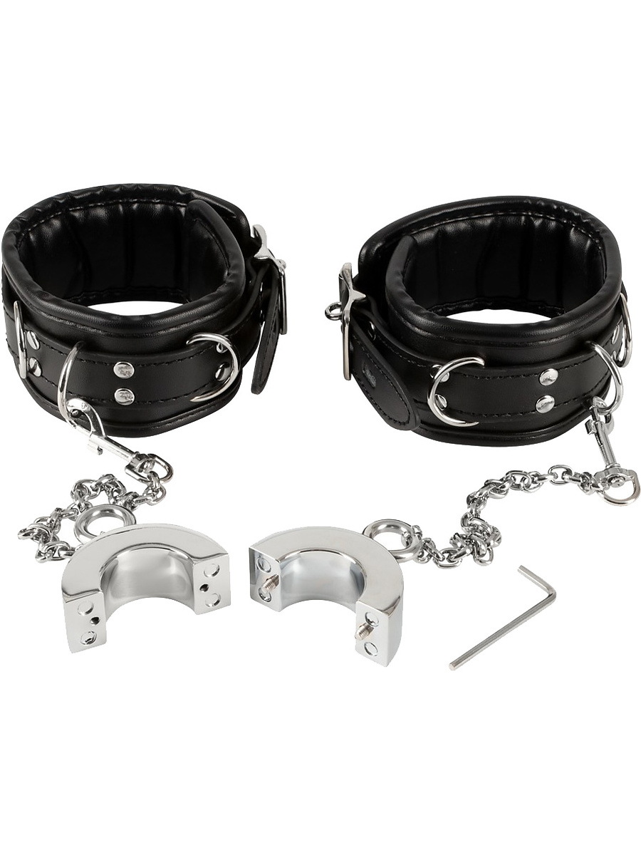 The PU-leather handcuffs are softly padded and adjustable for maximum comfort and best fit. With two carabiners, you can attach the chains to the shackles that go to the robust cockring.
