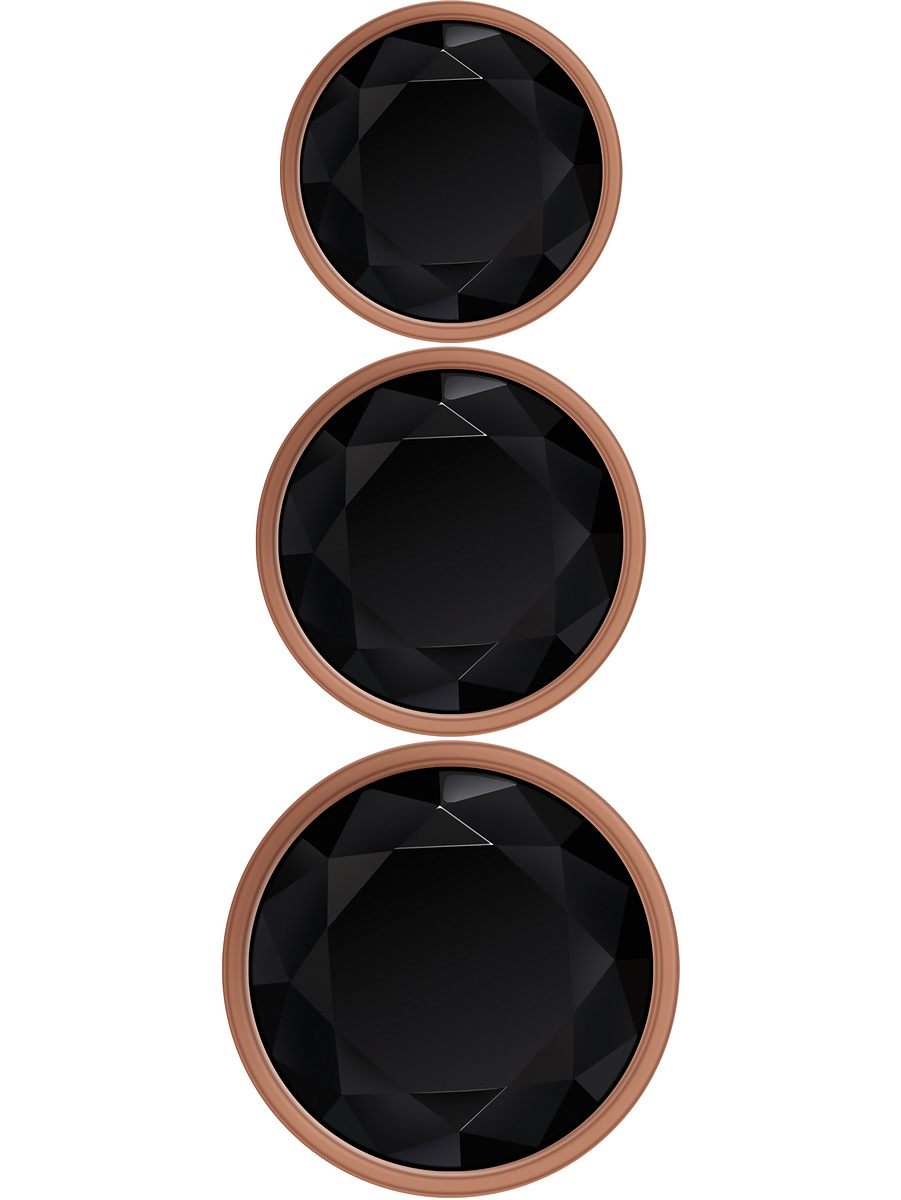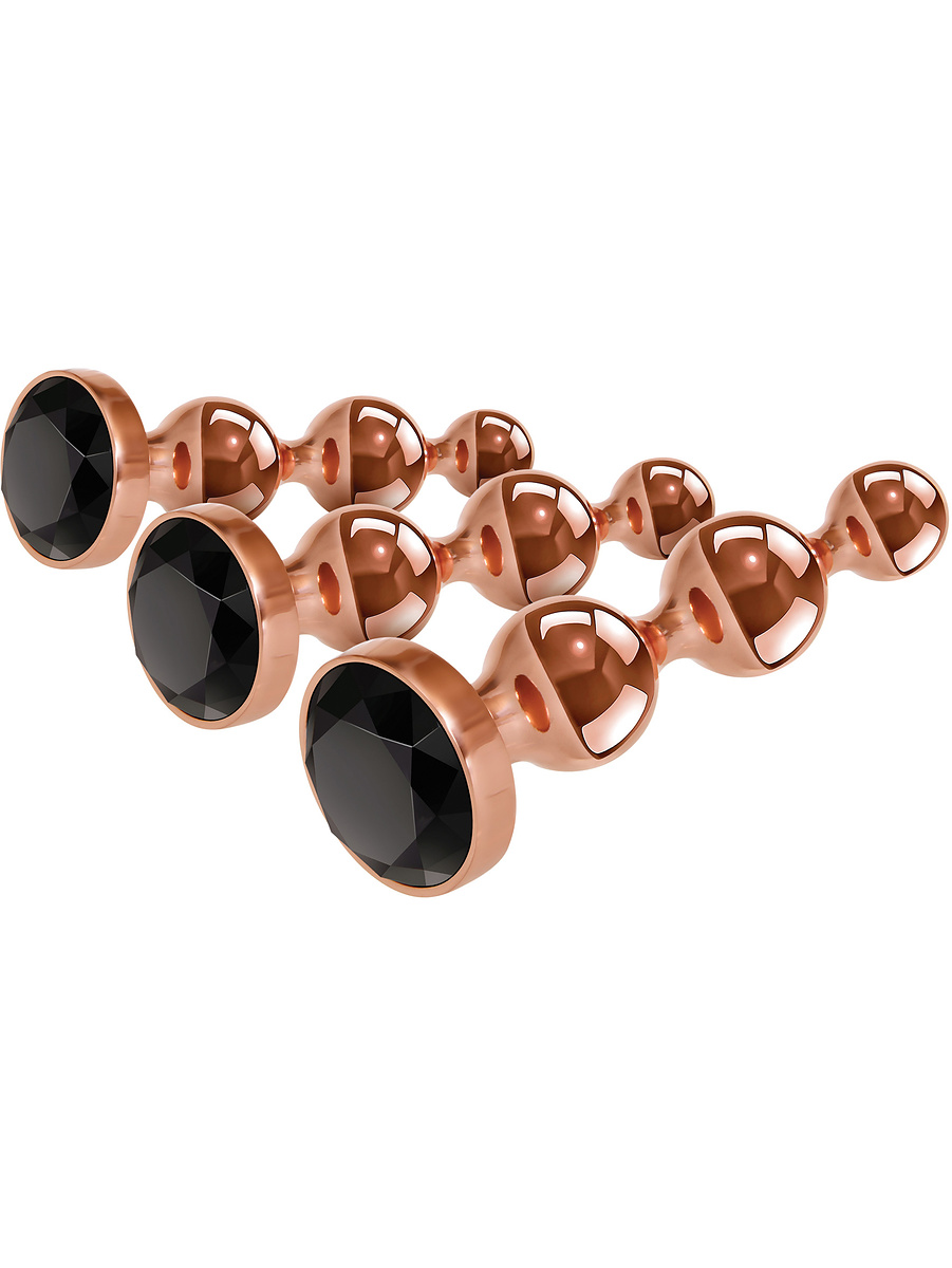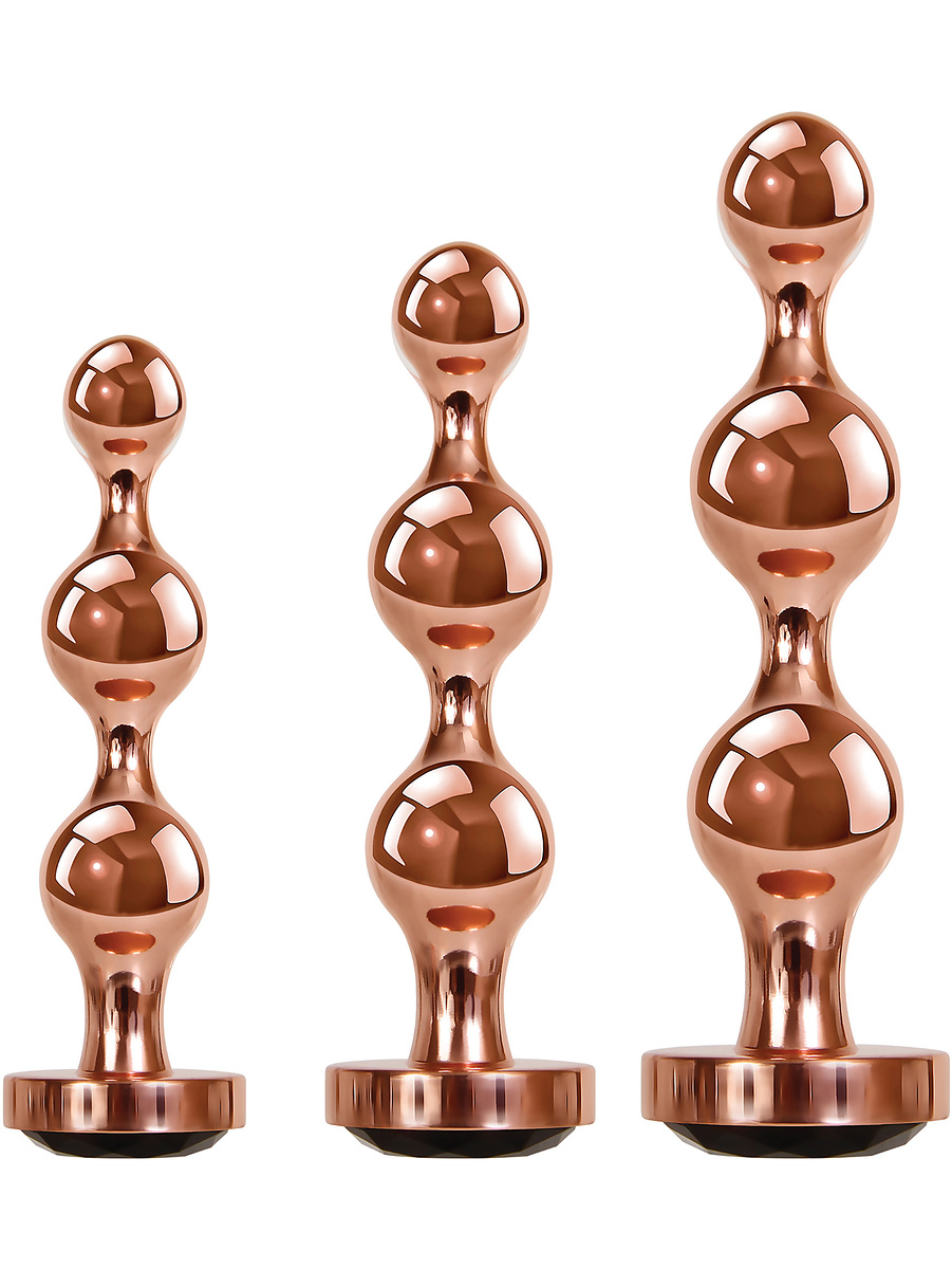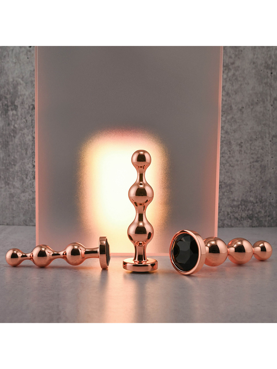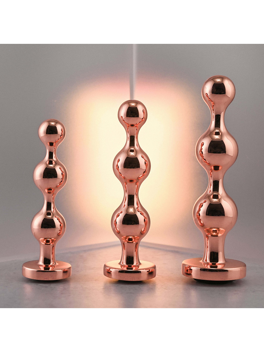 Each butt plug have a shiny shaft in rosegold aluminum-alloy. Along the shafts there are three beads in order of size similar to an anal chain that provide a comfortable insertion together with lubricant. Thanks to the metal, you can also try heating or cooling the plugs in water for temperature-play that can increase your pleasure.