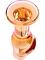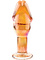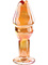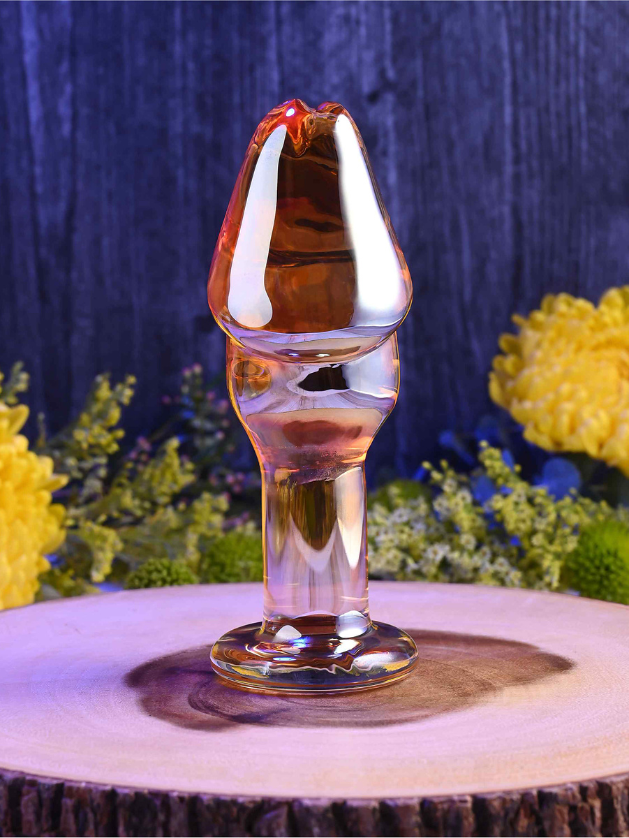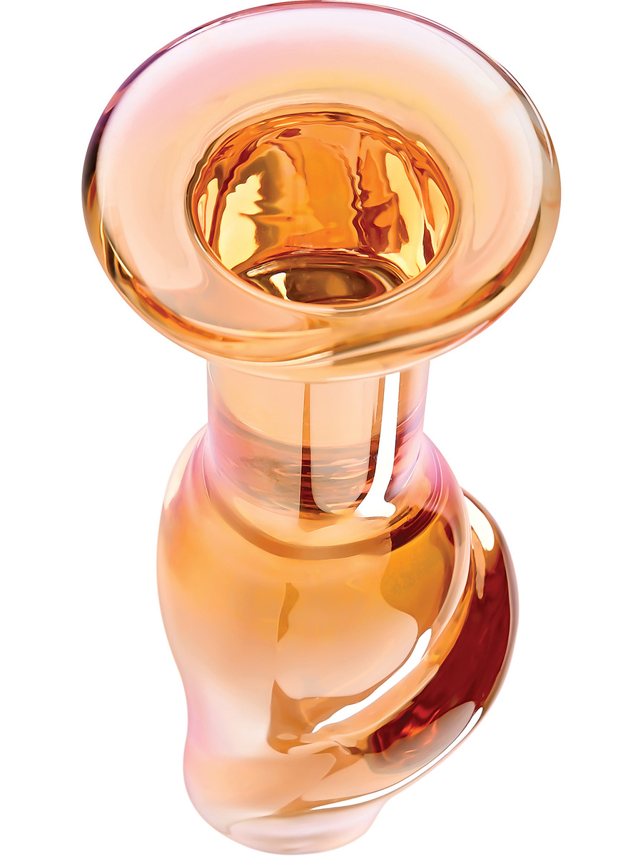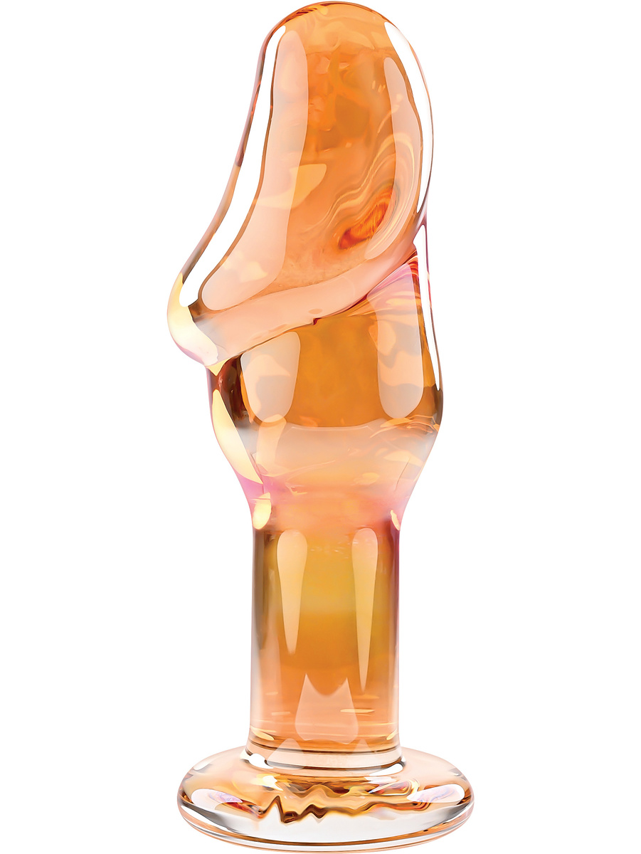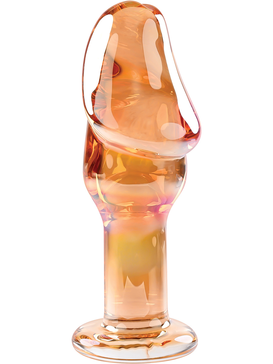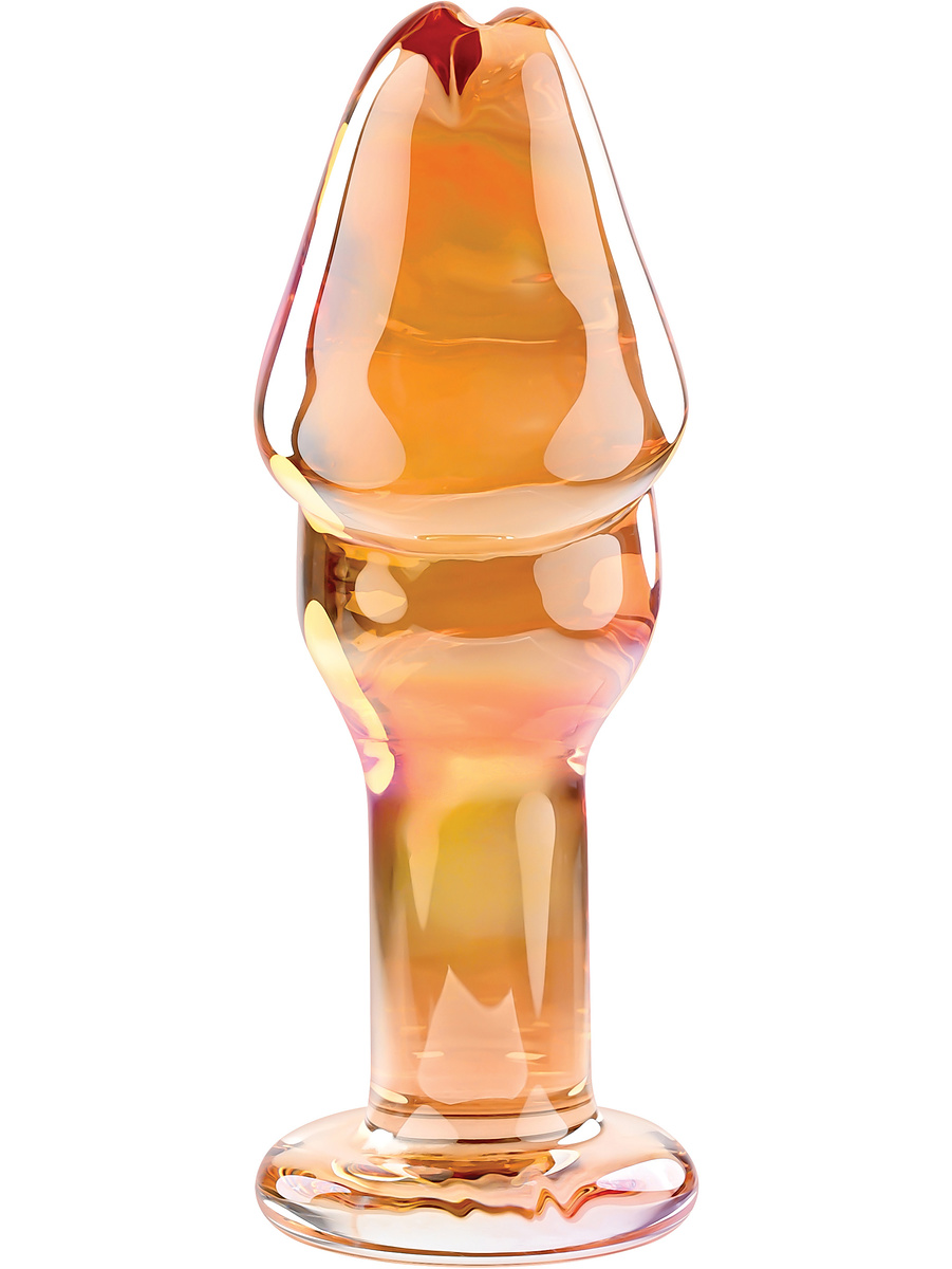 This glittering glass butt plug shimmers in gold, red and orange colors and catches the light from all angles. The marked and tapered top is followed by a narrow shaft and wide safety base.