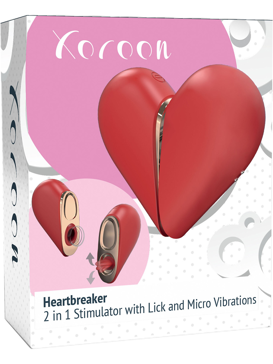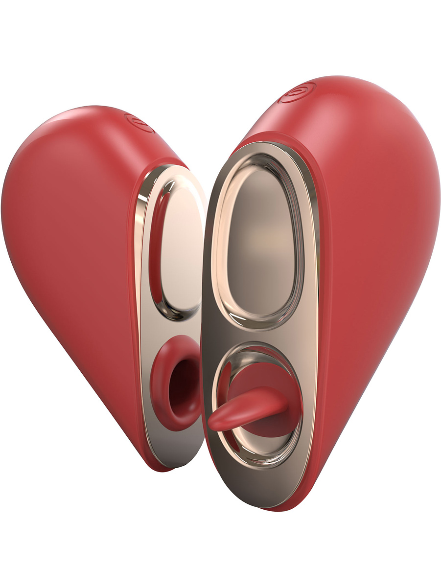 Split the heart and discover its two pacing options. The single part has an opening that embraces the clitoris or nipples to stimulate with micro-vibrations. The other part has a tongue with a licking function. Choose between 5 different vibration-speeds and 3 licking-speeds.