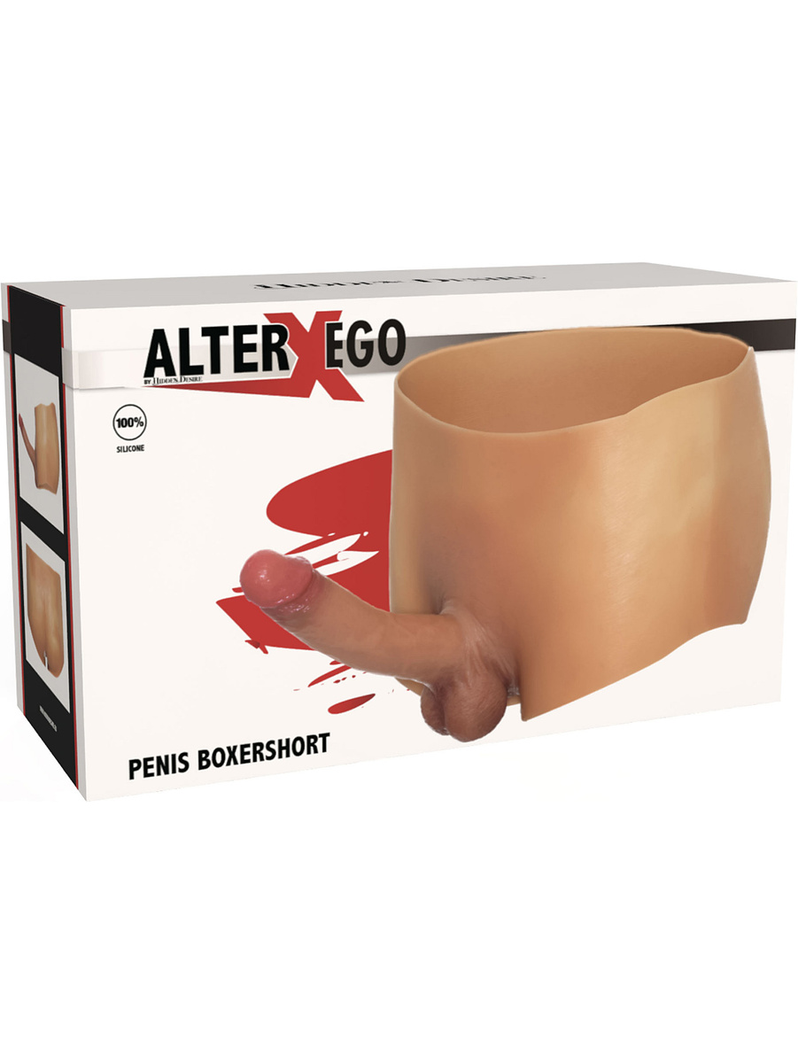 These Boxershots with an 18cm penis are designed to fit comfortably and complement your physique. The erect penis with a marked glans, pulsating veins and scrotum is made of a skin-like silicone material for a realistic look and feel.