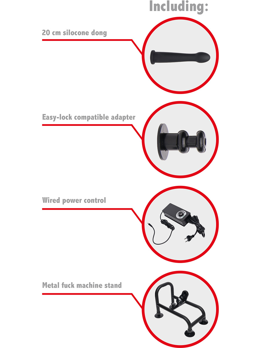 Bangers Fuck Machine Pro 3 delivers over 200 strokes per minute. It comes with a wired control-box where you can easily control the intensitylevel. It also comes with a 20 cm long silicone dildo, easy-lock adapter and metal machine rod.