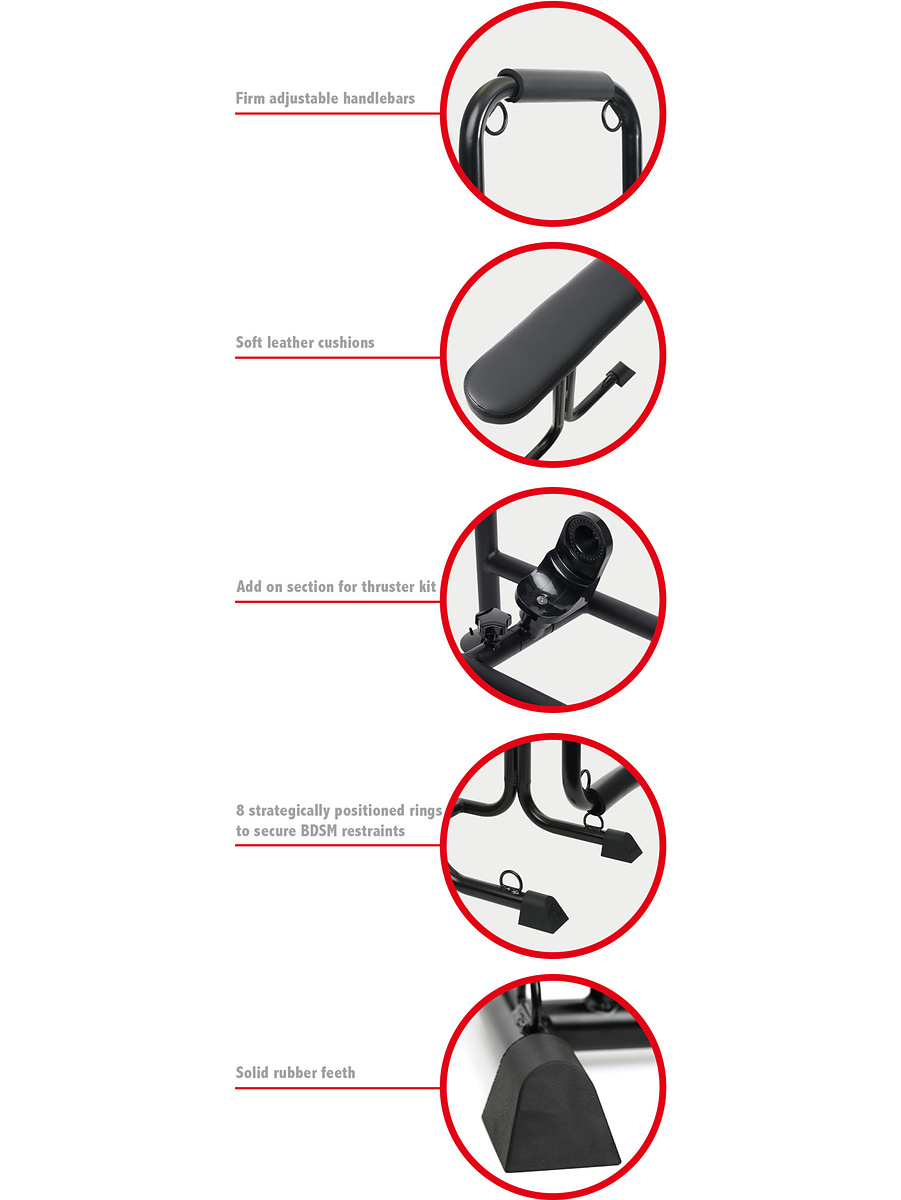 The bars can be adjusted to point up or down. It also has padded cushions for comfort and solid rubber feet that ensure stability and support for up to 150kg. Simply a durable, safe and versatile sex-furniture that provides endless excitement and pleasure.
