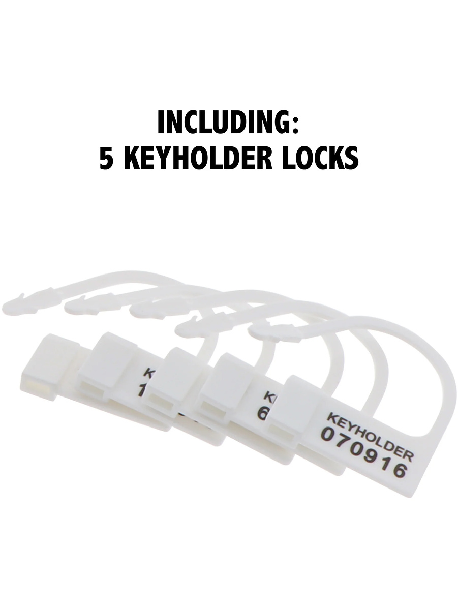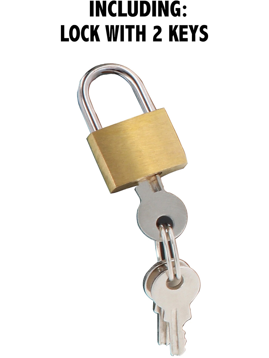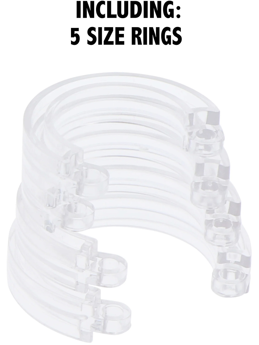 The chastity cage comes with five base rings in different sizes for a perfect and individual fit. It can be secured with the included padlock or the numbered seals to ensure it stays in place. The plastic locks can be easily snapped off if the temptation gets too great.