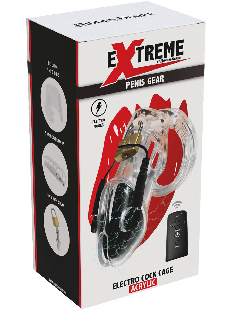 Take your chastity game to the next level with the Electroshock Cock Cage from EXTREME by HIDDEN DESIRE. This is the ultimate combination of control and stimulation - perfect for those who want to explore power play and electrical pleasure.