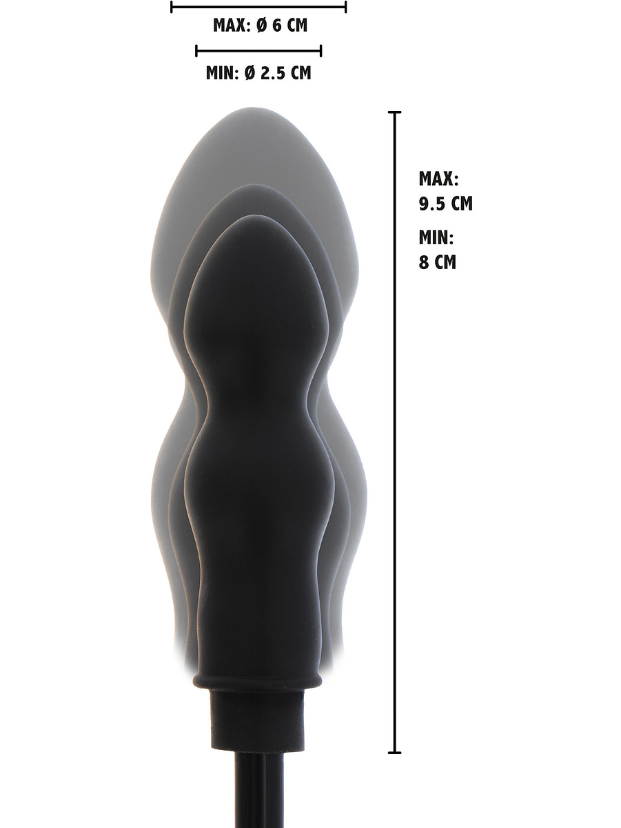 Once it's deep inside, start pumping with the hand pump to expand the plug for an incredibly fulfilling feeling. Maximum diameter and length in the inflated position are 6 and 9.5 cm respectively. Its shape and size make this plug suitable for those who are new to inflatable toys.