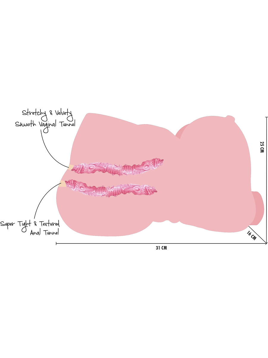 Fat Queen is made of soft and elastic TPE (Realistic Love Skin) material that feels close to the skin and conforms to the body. The realistic vagina and anal opening are anatomically shaped and lead to two different, tight channels with distinct internal textures – a stretchy, velvety vaginal tunnel and an extra tight, textured anal tunnel. Both provide intense stimulation and variety in every movement.