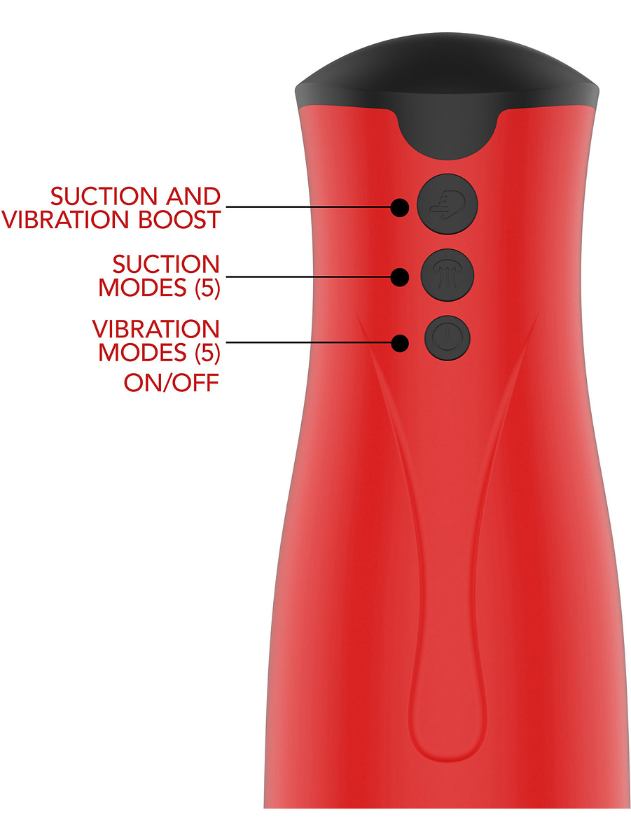 The design is stylish with a red exterior and a transparent and soft TPE-sleeve with small bumps for extra stimulation. Combine its suction-modes and vibrations to create the perfect, tailored suction. Choose between 5 suction-modes and 5 vibration-modes or use the turbo boost-button to reach new heights of pleasure.
