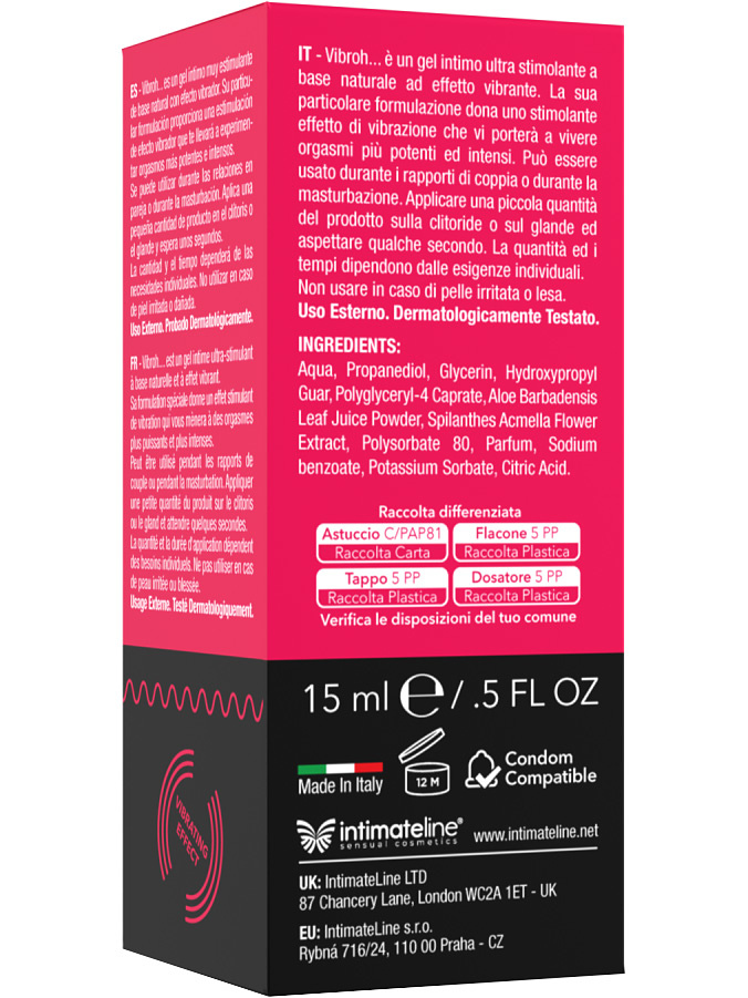 Vibroh is an ultra-stimulating intimate gel with a unique vibrating effect that intensifies pleasure and orgasms. Perfect for intercourse or masturbation, it increases sensitivity in intimate areas such as the vagina, labia, clitoris, glans and perineum.