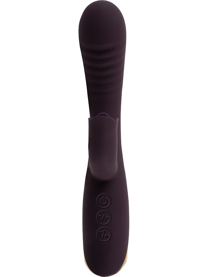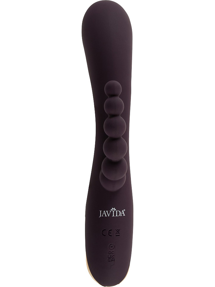 The Triple Vibrator from Javida is an elegantly curved rabbit-vibrator with an anal-stimulator that stimulates the vagina, clitoris and anus at the same time. Its curved shaft massages your insides and the G-spot with its grooved surface. The clitoris stimulator perfectly targets the clitoris with its soft tongues with the bead-shaped shaft stimulating you anally. Triple stimulation at its best!