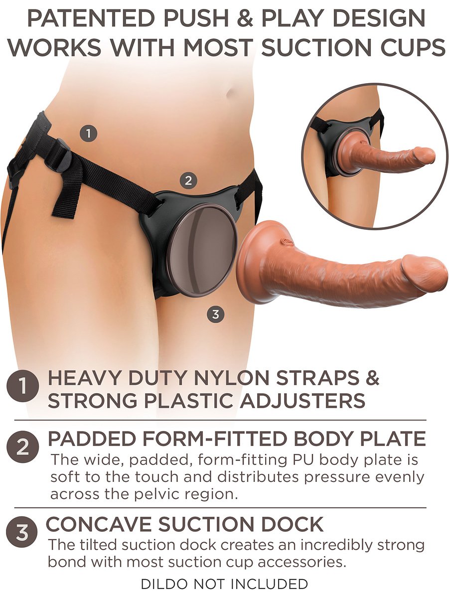 The patented Comfy Body Dock® Strap-On Harness from King Cock Elite lets you enjoy comfortable penetration on a whole new level. Simply attach your favorite King Cock Elite dildo (or any dildo/vibrator with a suction cup smaller than 8.6 cm in diameter) to the innovative suction cup-adapter to explore for exciting pegging or lesbian penetration-play.