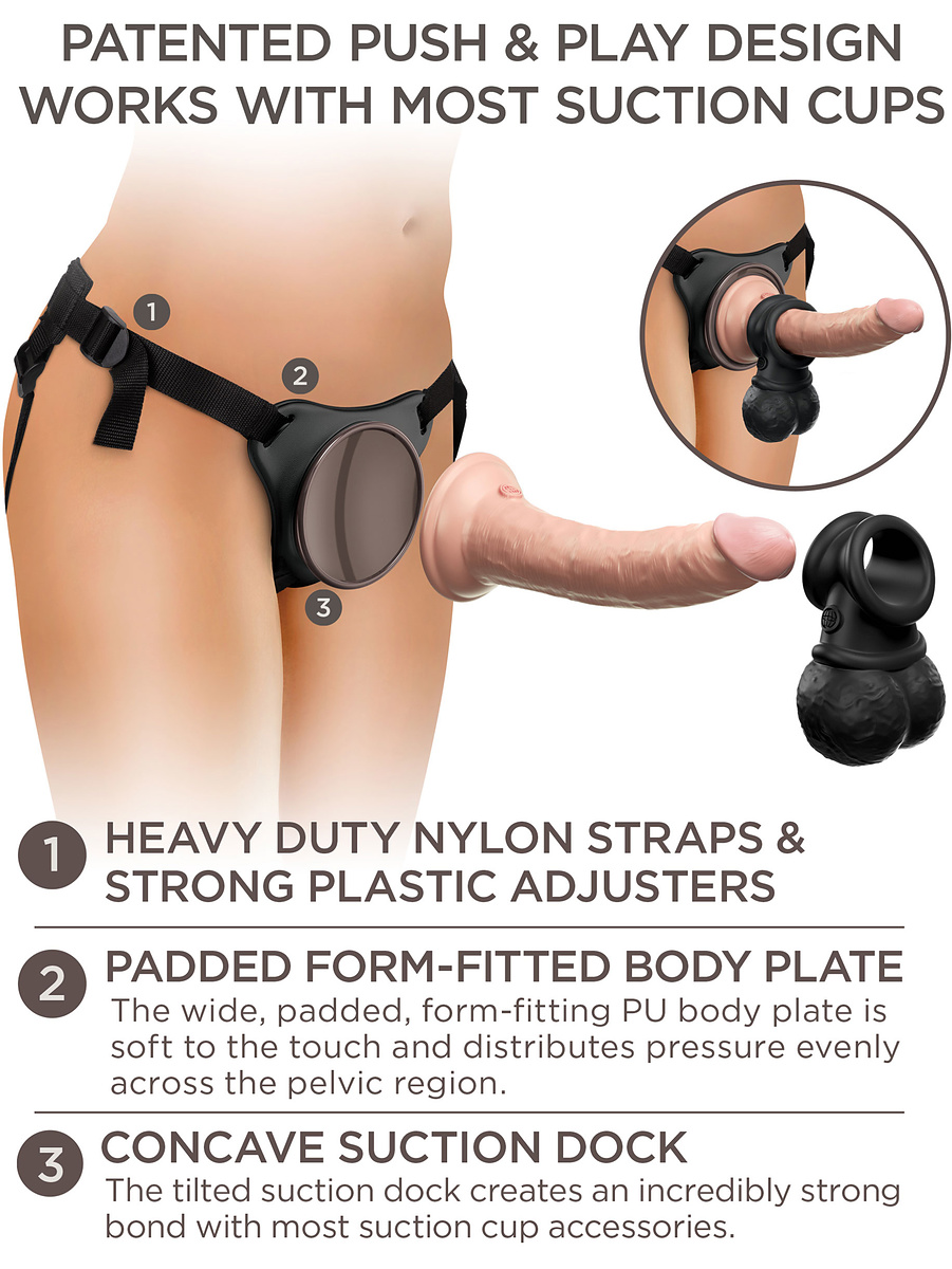 The user-friendly strap-on system is based on the anatomically curved body-plate with a suction cup-adapter to which the dildo's suction cup attaches securely. It provides an extra comfortable experience thanks to its softly padded bodyplate.