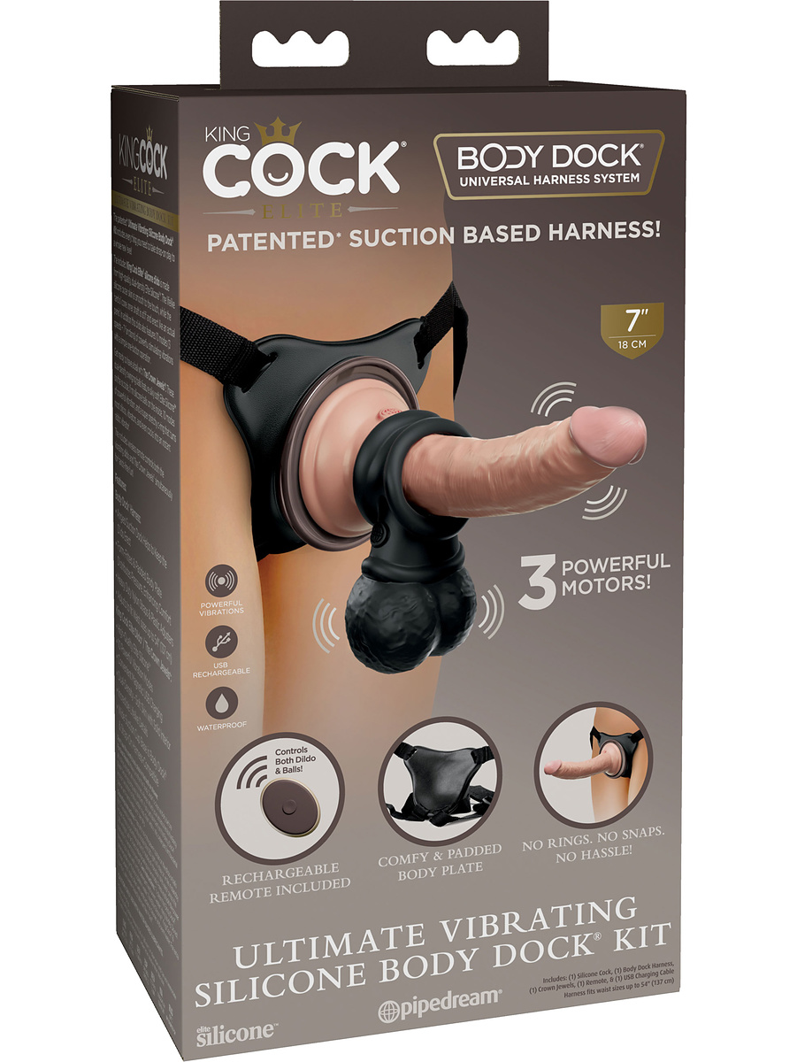 The patented Ultimate Vibrating Silicone Body Dock® Kit from King Cock Elite contains everything you need to take your strap-on play to a whole new level! It includes a comfortable strap-on harness, a very realistic dildo vibrator and vibrating scrotum for exciting pegging or lesbian penetration-play.