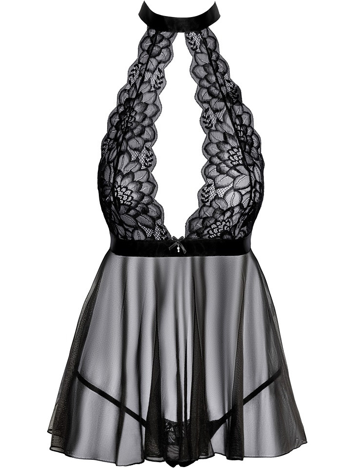 Short and flared Babydoll from Kissable made of beautiful transparent black lace (top) and delicate powernet (skirt). It is soft and stretchy for a comfortable fit. It also has a design that leaves the back bare while the cutout at the front accentuates the breasts.