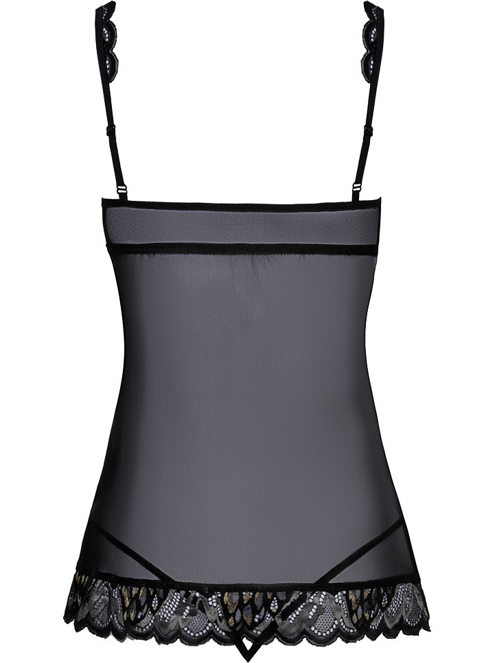 A babydoll and thong set from Kissable, made of delicate powernet and beautiful lace with gold- and silver-details. It is soft and stretchy for a comfortable fit.