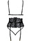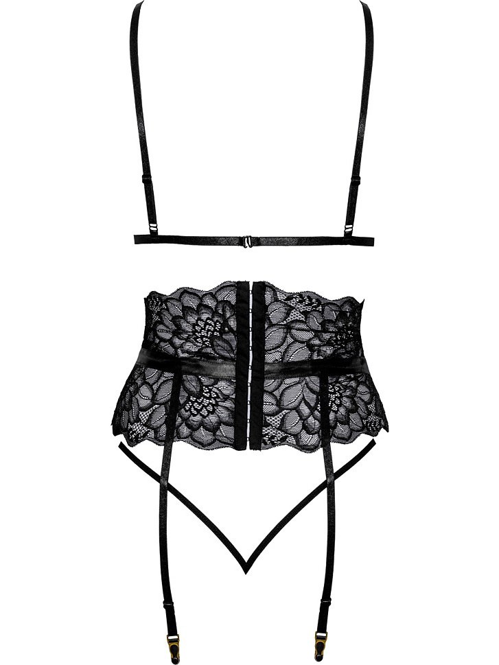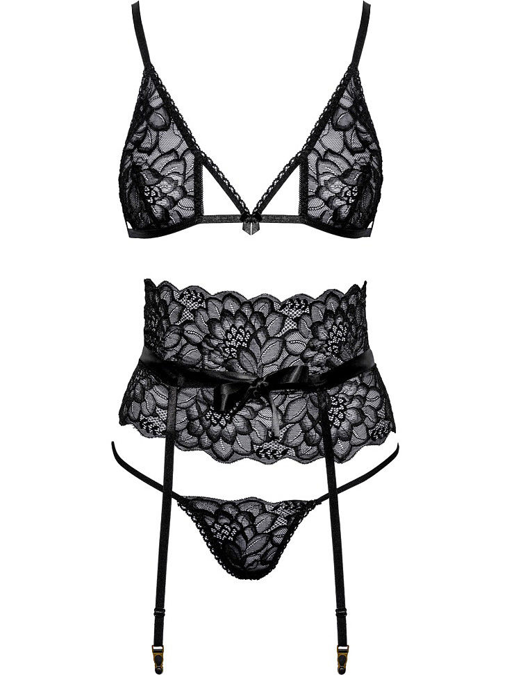 The stylish bra has adjustable shoulder-straps and hook-fastening at the back. The garterbelt accentuates the waist and has beautiful satin ribbons that can be tied at the front. It has hook fasteners at the back and the straps can be adjusted. The thong has a seductive design with two narrow, stretchy straps that join at the crotch.