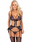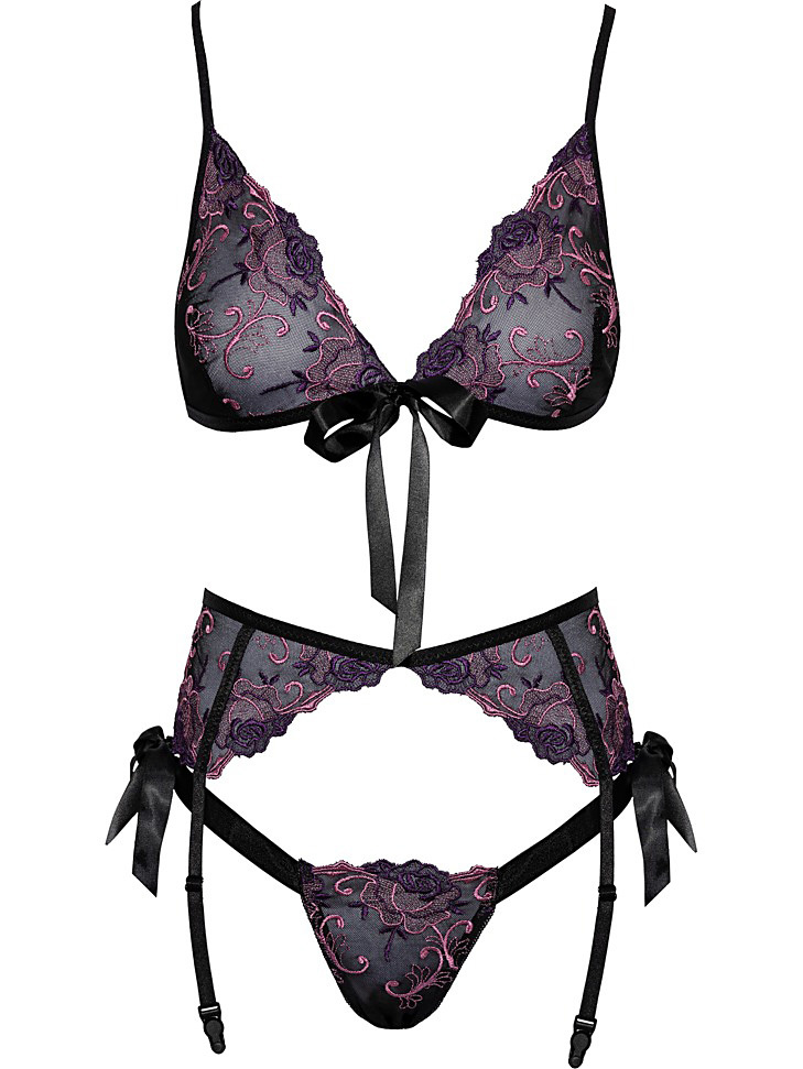 There is a playful satin bow on the front of the bra and on each side of the thong. The bra has a buckle at the back and adjustable shoulder-straps. The suspender also has a buckle at the back and adjustable straps. The thong has a seductive design with two narrow, stretchy straps that join at the crotch.