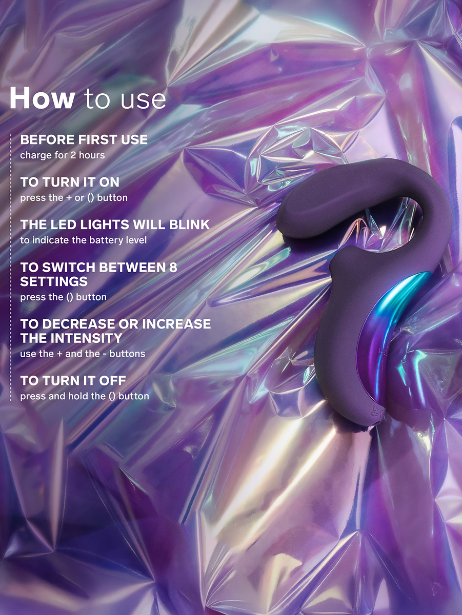 Indulge: Press + or () to start it – start at the lowest speed and gradually increase the intensity-level. With the button in the middle you also switch between 8 different modes.