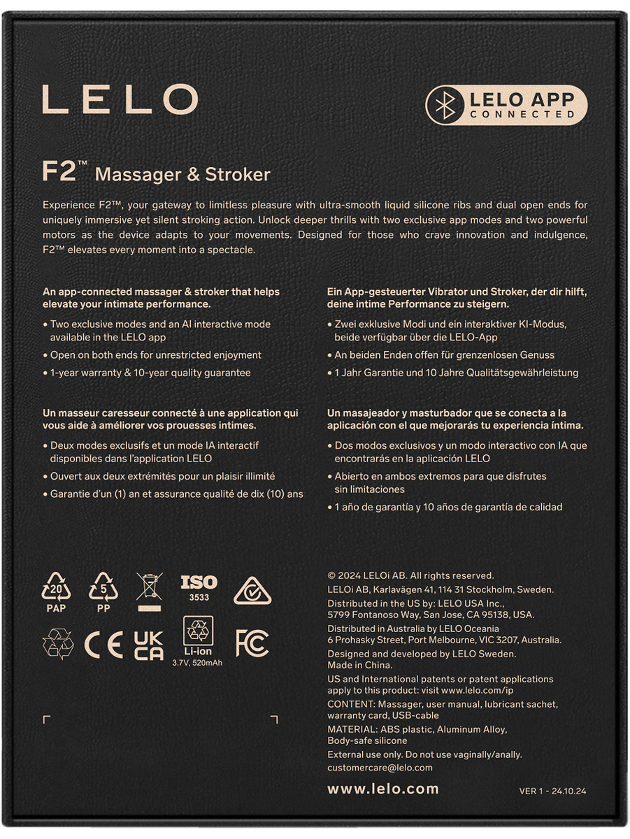 F2S™ is more than just an advanced masturbator – it’s an innovative stamina trainer that helps you improve your sexual stamina and intensify your orgasms. With a luxurious liquid silicone interior, dual orifices and powerful stimulation settings, F2S™ takes your pleasure to the next level. Connect it to the LELO™-app and unlock exclusive training-programs and an interactive AI-mode that adapts to your rhythm in real time.