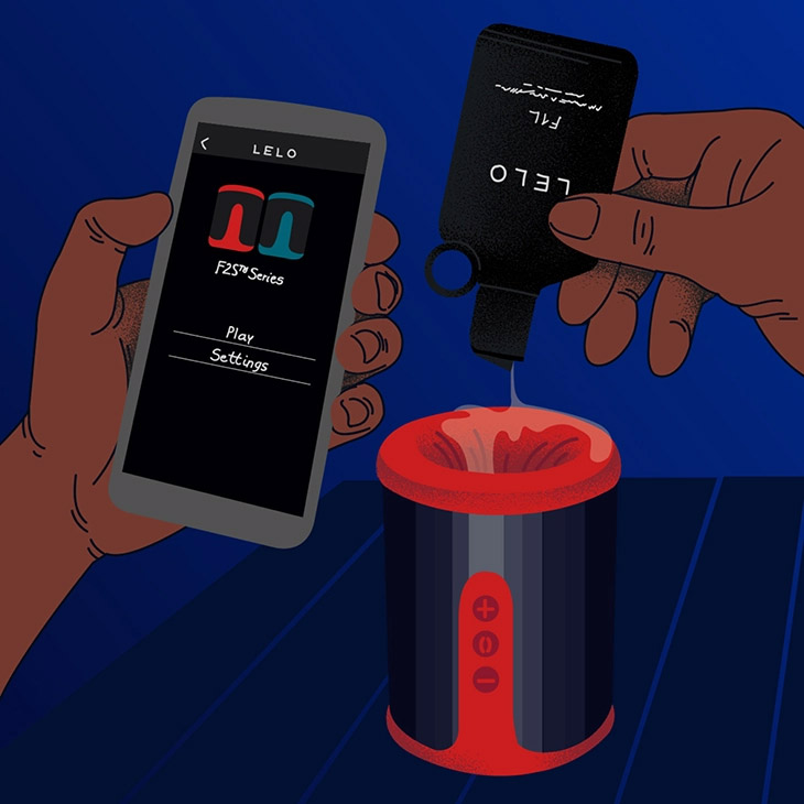 Prepare: First, download the LELO™ app and connect your device to activate the exclusive app modes. Apply a generous amount of LELO Personal Moisturizer to F2S™ internal sleeve. The more, the better. |