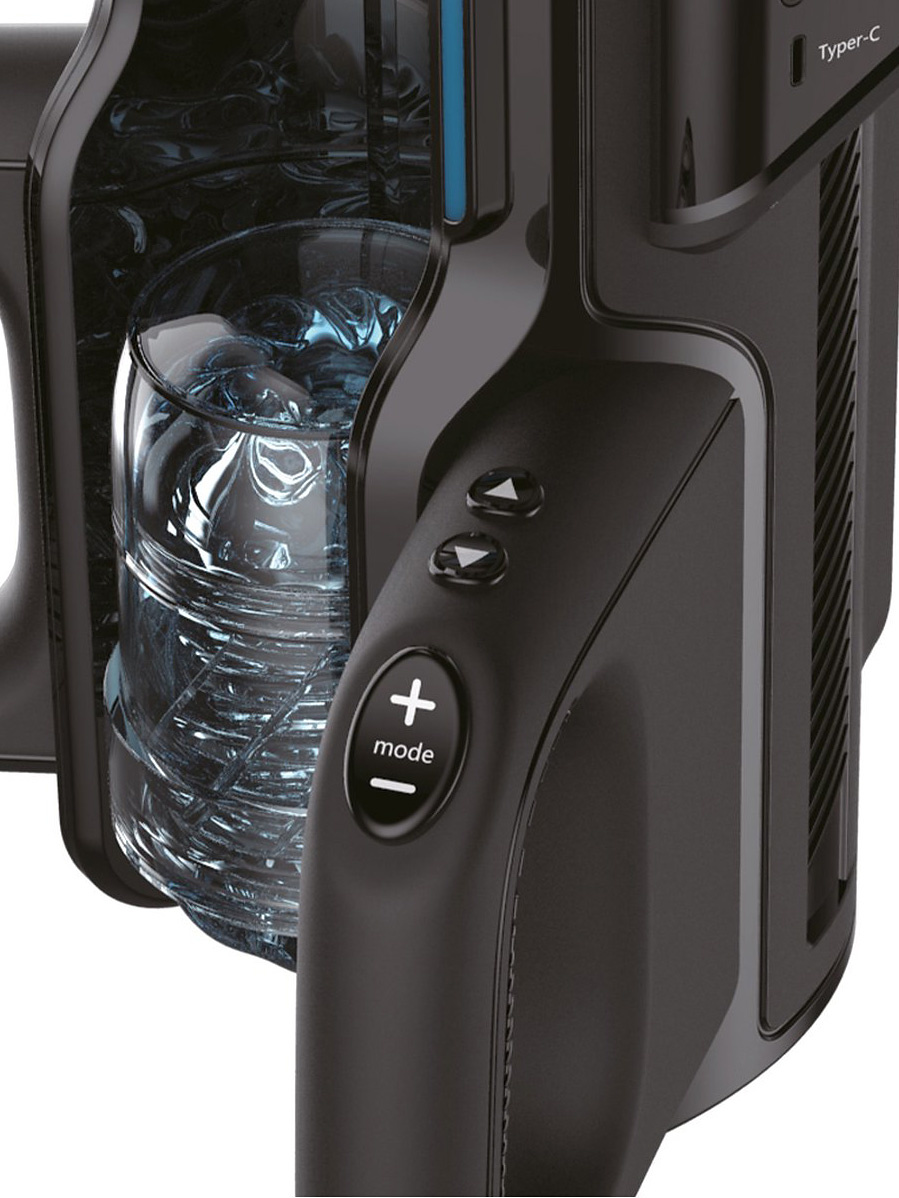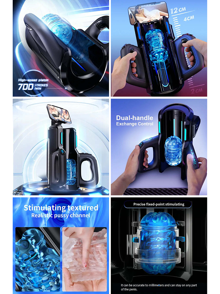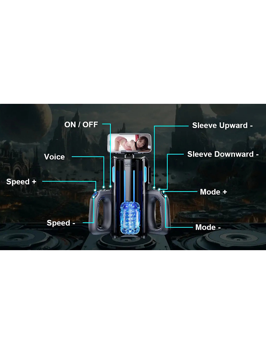 The masturbator has a telescopic thrusting-function that makes the sleeve move up and down and delivers up to 700 strokes per minute. With the buttons on the handles, you can choose between 10 thrusting-modes and 10 thrusting-speeds. There are also buttons where you set the position of the sleeve.