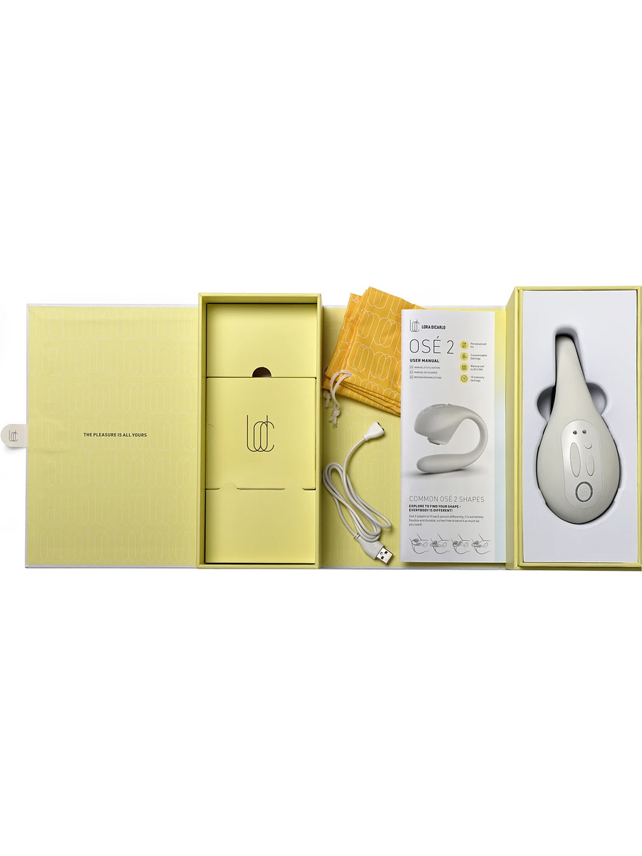 Osé 2 has an even more inclusive and intuitive fit with additional angles to provide maximum comfort to more bodies. The intensity levels of the clitoris stimulator are more varied and the smaller and softer massage bead offers the same "come-here" movement but with a more comfortable fit.