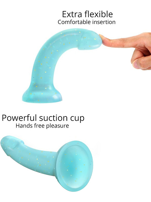 Nightfall has a beautiful blue/turquoise color with sparkling, golden stars. The dildo has a curved shape that provides comfortable penetration for both vaginal and anal use. It is made of soft silicone that gives a fantastic touch, the feeling is extra pleasant together with water-based lubricant. Let its well-thought-out design guide you, designed to fit your curves.