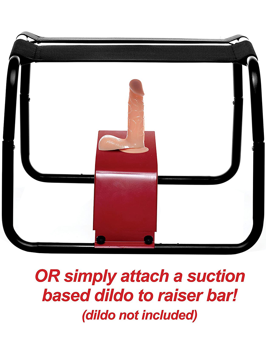 The stool comes with a practical device where you can attach a dildo (not included) for a solo riding-session. Use your favorite dildo, just make sure the dildo has a suction cup so it can be attached to the red device. It also comes with a "harness" that you can attach to the device to attach a suction cup/wide base dildo (so it doesn't go through the hole in the harness).