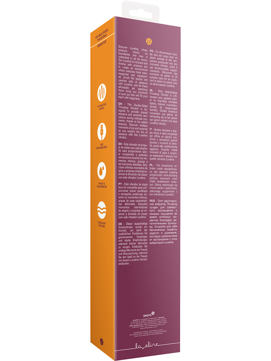 This double-sided thrusting vibrator is made of silky-smooth silicone that feels good against the skin, preferably together with water-based lubricant. At each end is a powerful motor. With the three buttons in the middle, you can choose between 30 different stimulation-modes that provide a wonderful variety and allow you to customize your pleasure experience. You can easily charge it via the included USB-cable. 120 minutes of charging gives a battery-life of 90 minutes.