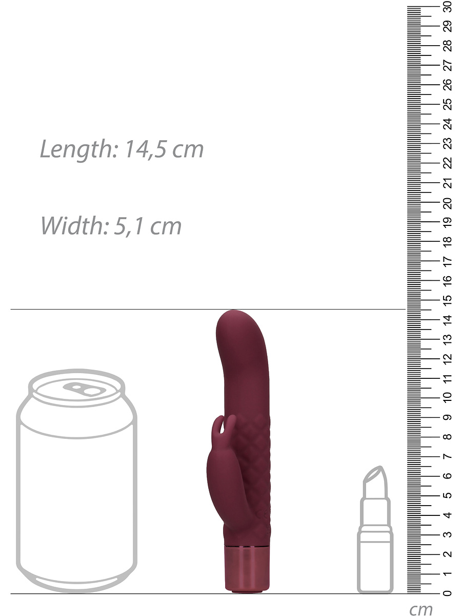 A small rabbit vibrator that stimulates your insides and clitoris at the same time. Silky-smooth surface in silicone with nice textures a little further down the shaft. Choose between 7 exciting vibration-modes. It is waterproof and rechargeable via the USB-cable (70 minute battery-life).
