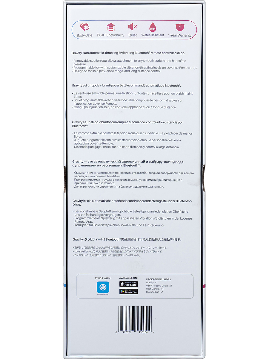 Gravity can be used for fun solo-play and controlled via your mobile for endless possibilities. Download the Lovense-app and connect Gravity via Bluetooth. Its functions can also be controlled via the internet remotely, perfect for long-distance relationships when you want your partner to take control.
