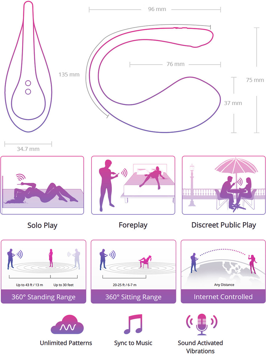 Lush 3 delivers strong, but quiet (up to 43 dB), vibrations so you can use it even in public places. Its motor is four times more powerful compared to many other vibrating egg and panty vibrators. You can both create, share and download different vibration patterns. You can also program three vibration-programs and ten patterns that are saved and can be used when you control it via the button on the antenna.