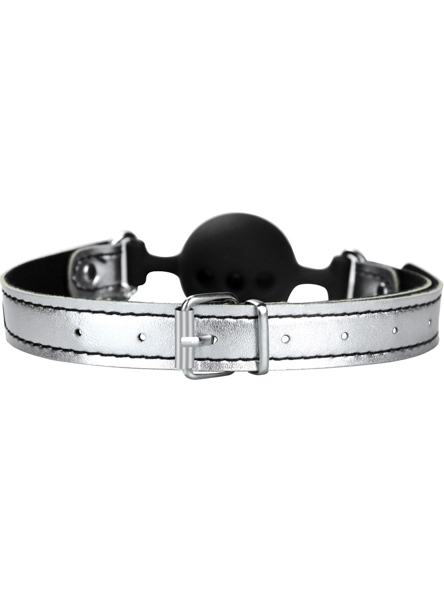 Take your BDSM-adventures to the next level with this stylish gag ball with nipple clips. The ball (4.3 cm) is made of silky-smooth silicone with breathing holes for a pleasant experience when your partner is silenced. The strap around the head is adjustable (38 - 53 cm) for a good fit and has a metallic color for a nice look.