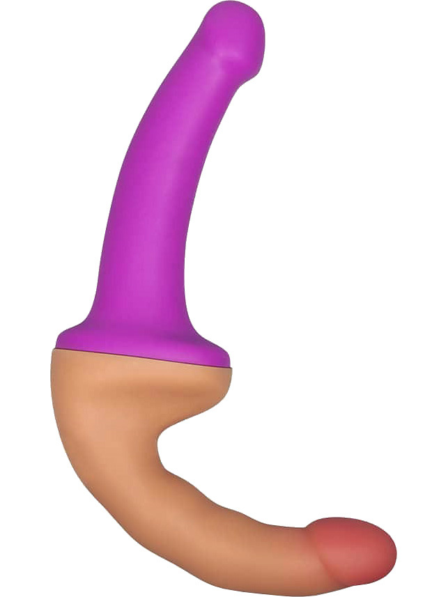 Holy Dong is a double-dildo that can also be used as a strap-on with or without a harness for exciting penetration-play with your partner. Place the skin-colored dildo vaginally and penetrate your female or male partner with the purple dildo.