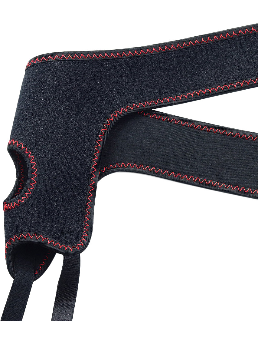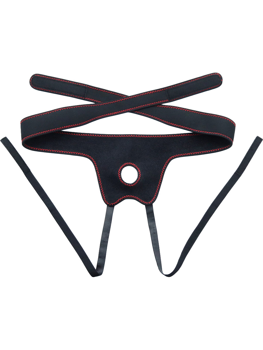 The harness is easy to put on and take off. The hole at the front of the harness has a diameter of about 3.8 cm but is stretchable to fit many dildos. Place the supplied dildo or any other dildo you have at home to explore exciting penetration-play.