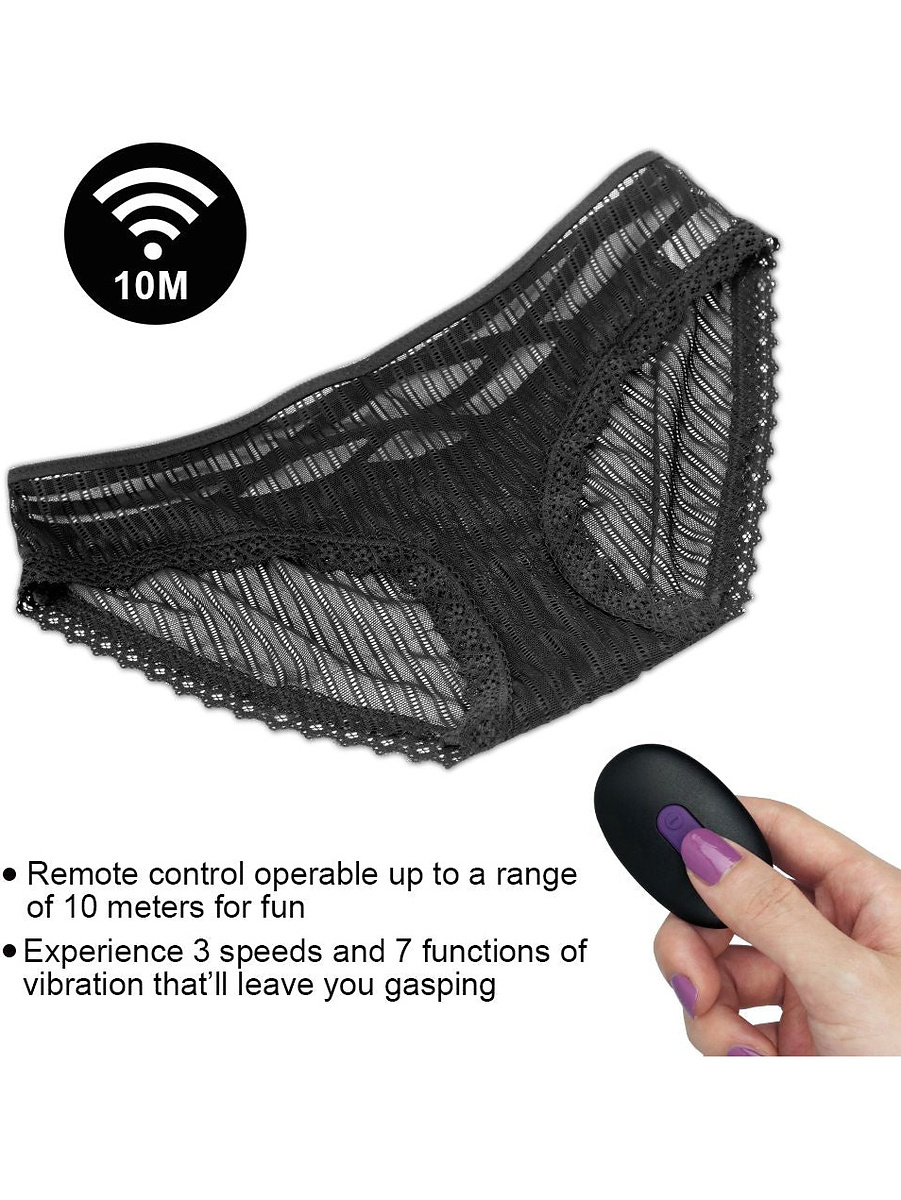 The stylish black lace-panties have delicious straps at the back and a smart inner pocket where the powerful bullet vibrator is placed. The panties in One Size are made of 80% polyamide, 10% elastane & 10% cotton, adapted for a flexible and comfortable fit.