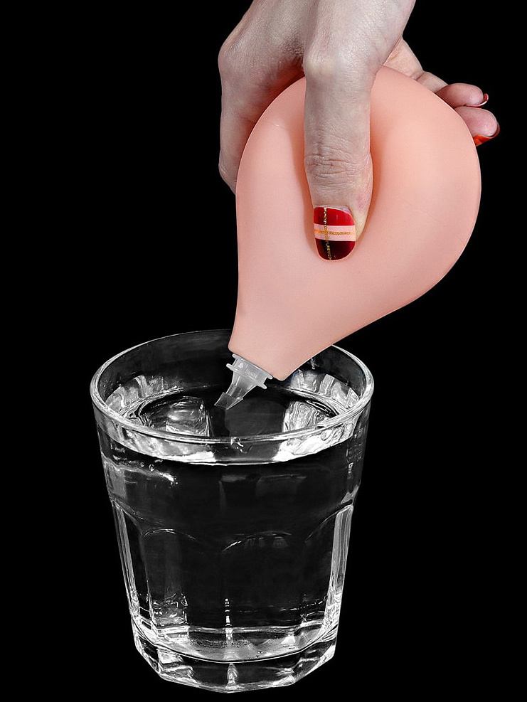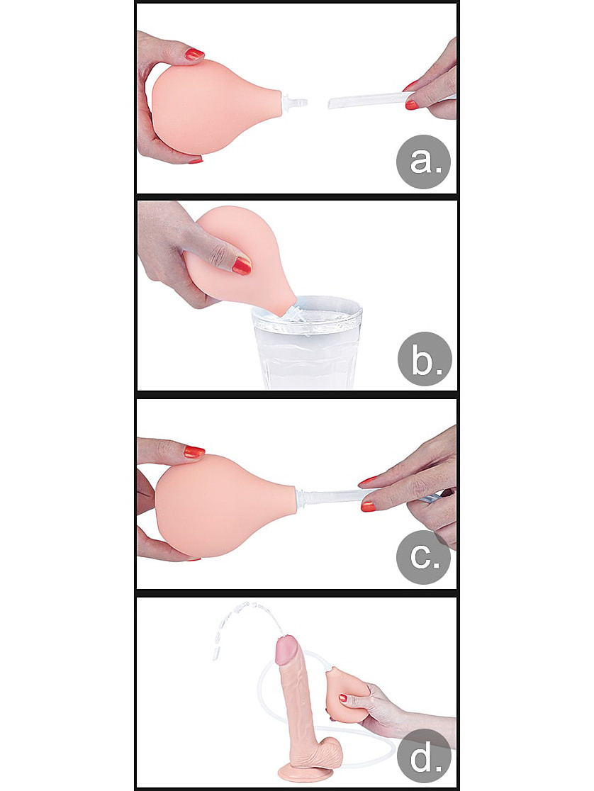 Remove the hose from the hand pump. Suck up the liquid by squeezing the hand pump and releasing. Attach the hose to the hand pump and pump when you want it to squirt. You can use any light-flowing liquid you wish; water, semen-like lube, or regular water-based lube. If you use lubricant, however, you may need to dilute this with a little water so that the hose does not clog.