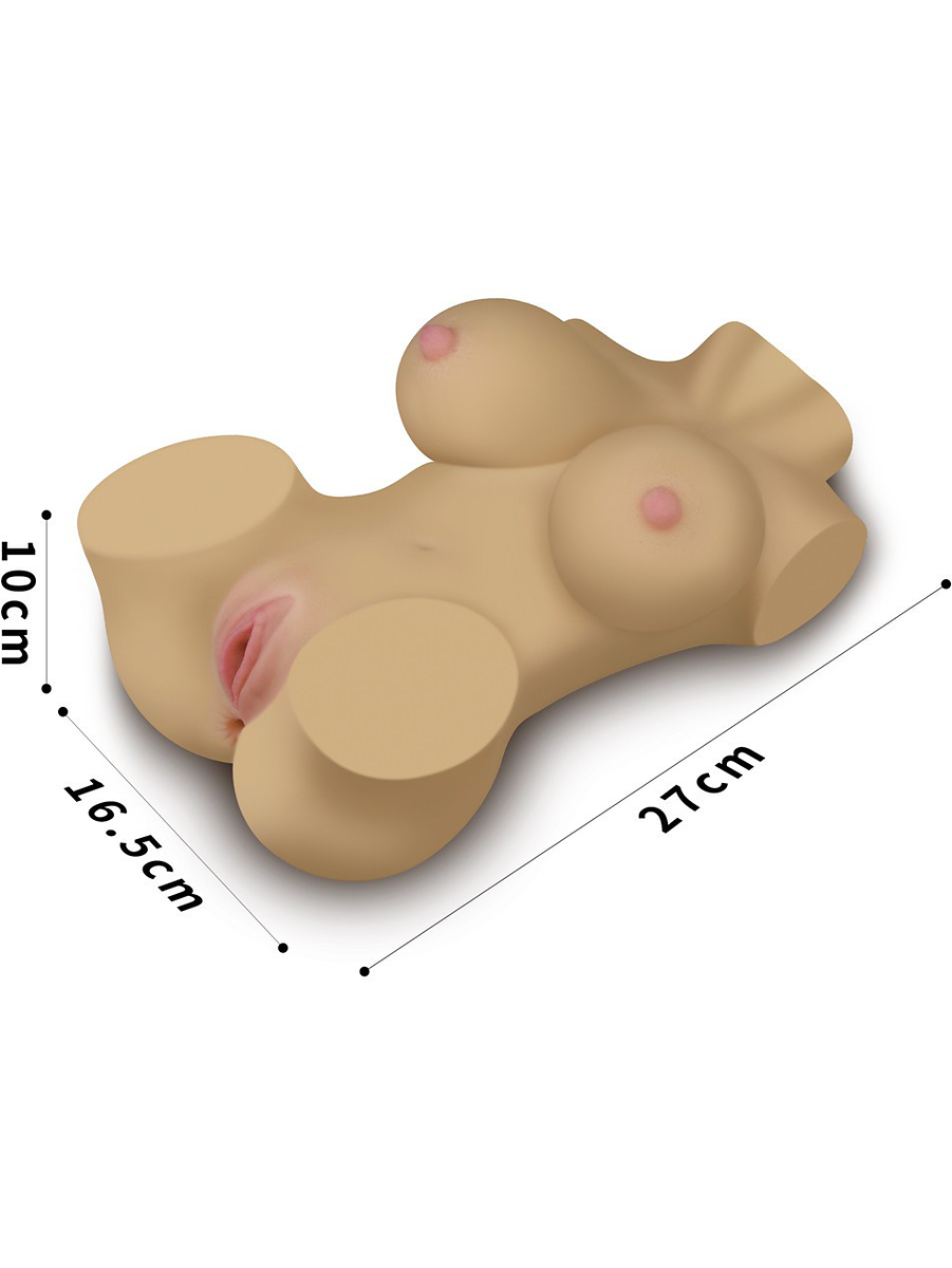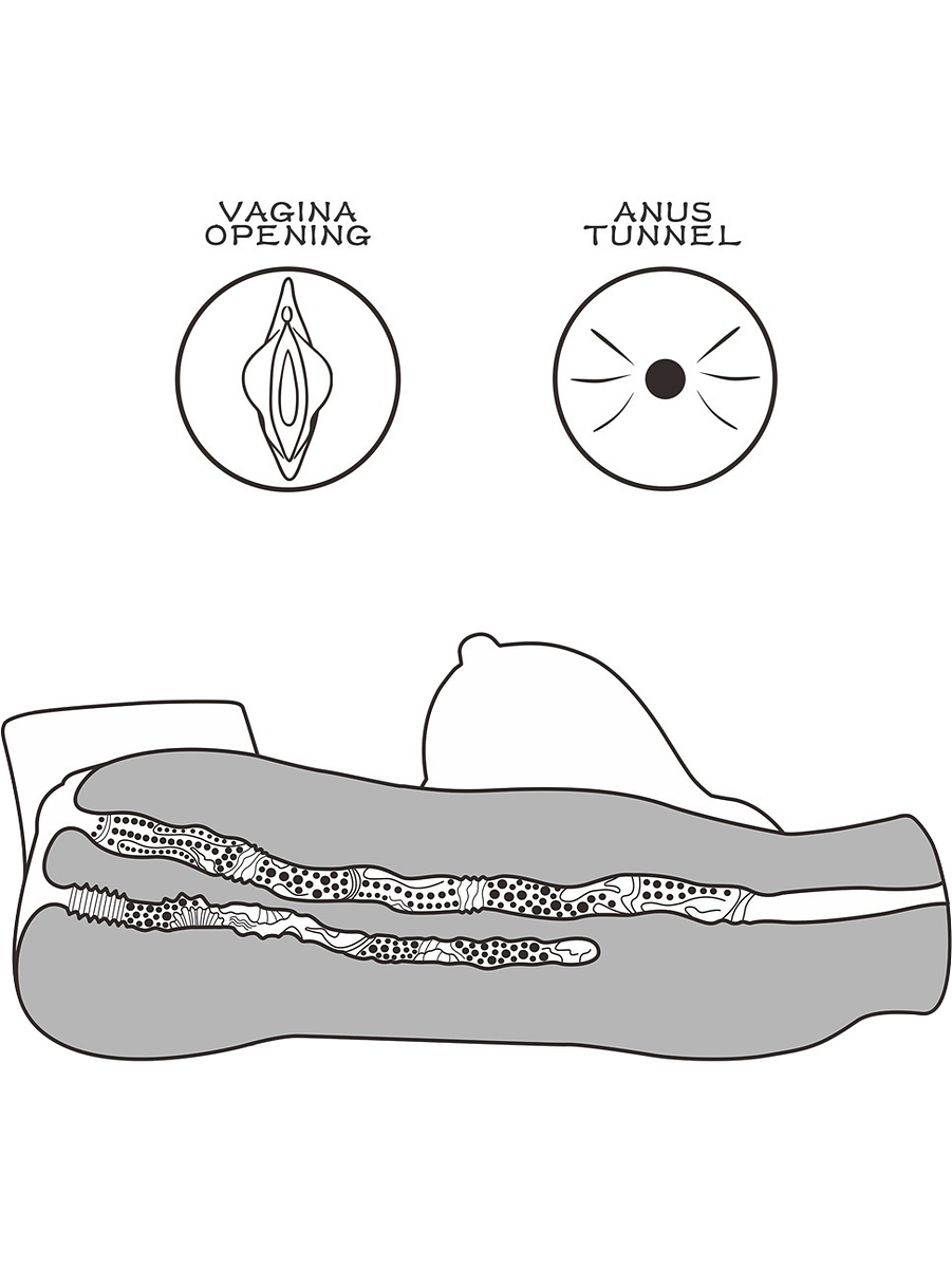 The vaginal tunnel (24 cm deep) has many exciting textures waiting to stimulate your penis as you slide deep inside. The anal tunnel is a bit tighter and full of textures and curves. Experiment to find the best positions - For example, you can lay it flat or hold her close while you explore the two holes.