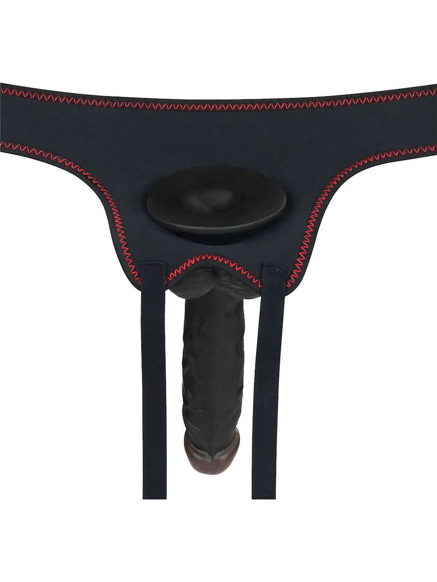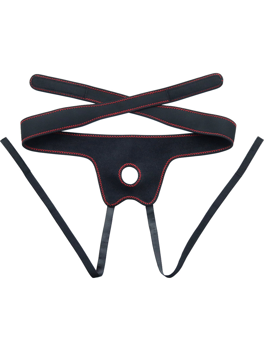 The harness is easy to put on and take off. The hole at the front of the harness has a diameter of about 3.8 cm but is stretchable to fit many dildos. Place the supplied dildo or any other dildo you have at home to explore exciting penetration-play.