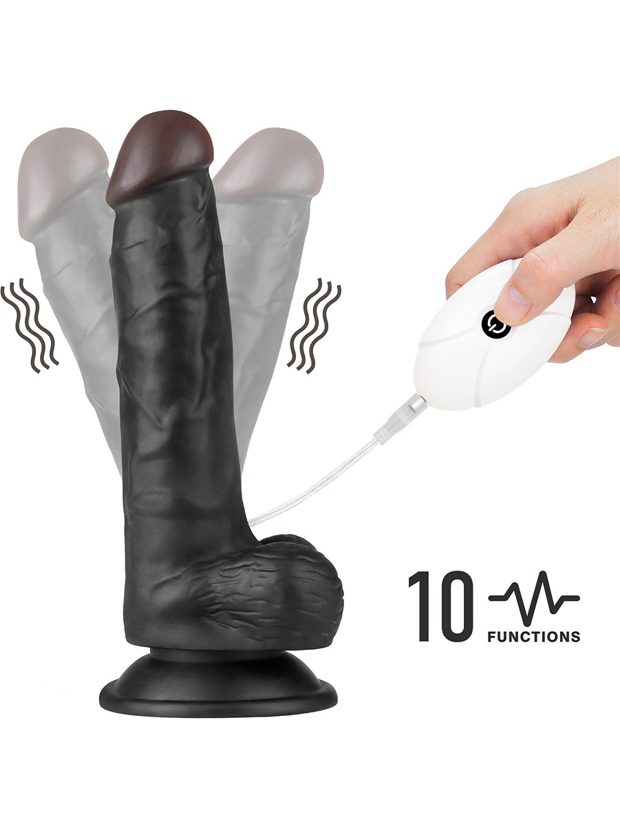 The included vibrating dildo has an incredibly realistic design with a highlighted glans, pulsating veins and scrotum that gives an authentic feel. It is made of flexible TPE and offers 10 different vibration-modes (2 speeds & 8 patterns) that you control via the wired remote.