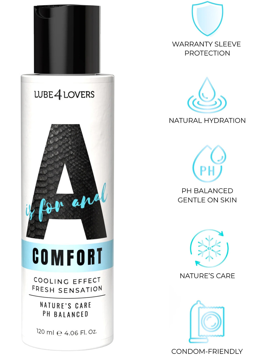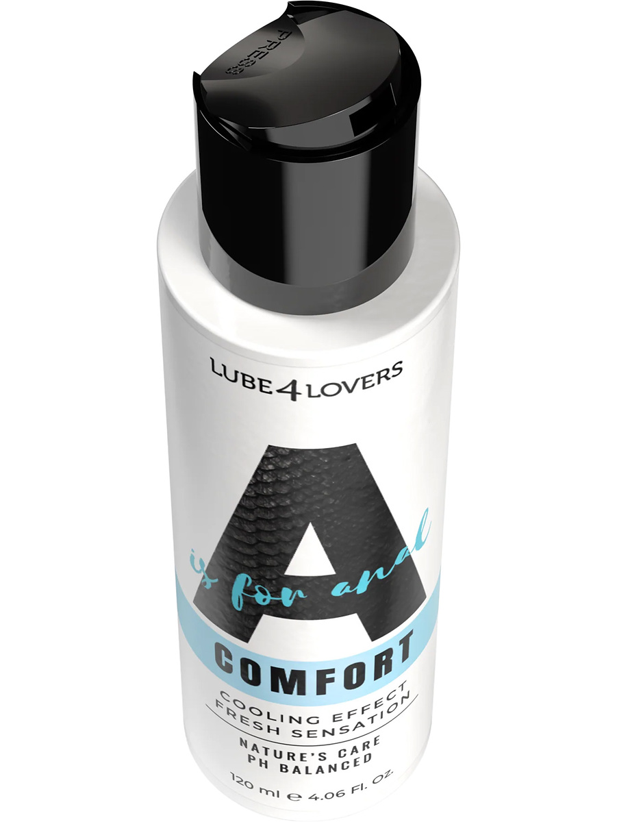 A is for Comfort is a water-based lubricant developed for anal sex to provide safe and longlasting glide. The pH-balanced formula is dermatologically tested and enriched with naturally moisturizing ingredients for a comfortable experience.