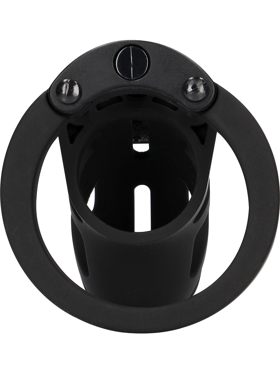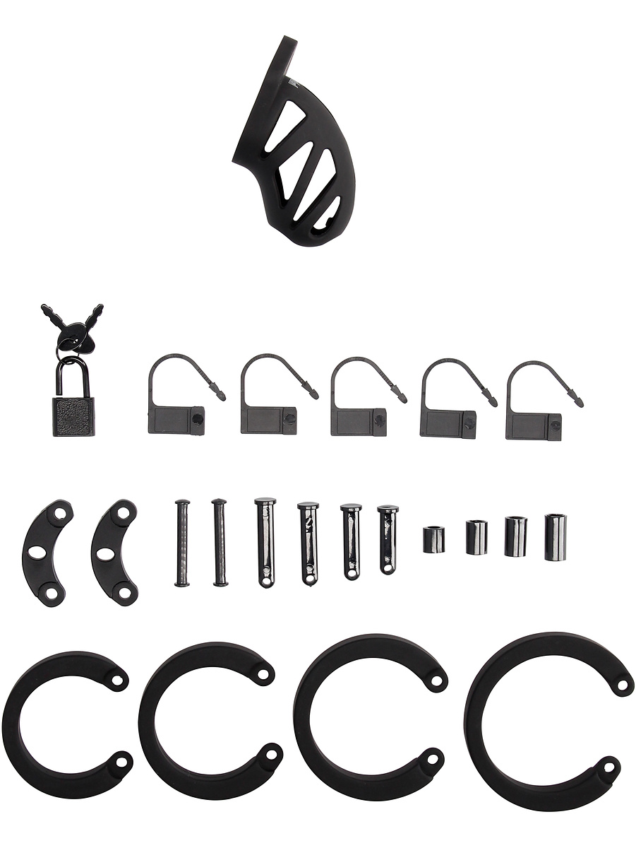 The cage consists of two parts that fit perfectly together. The base ring (4 sizes included) is connected to the chastity cage for a perfect fit for your penis.